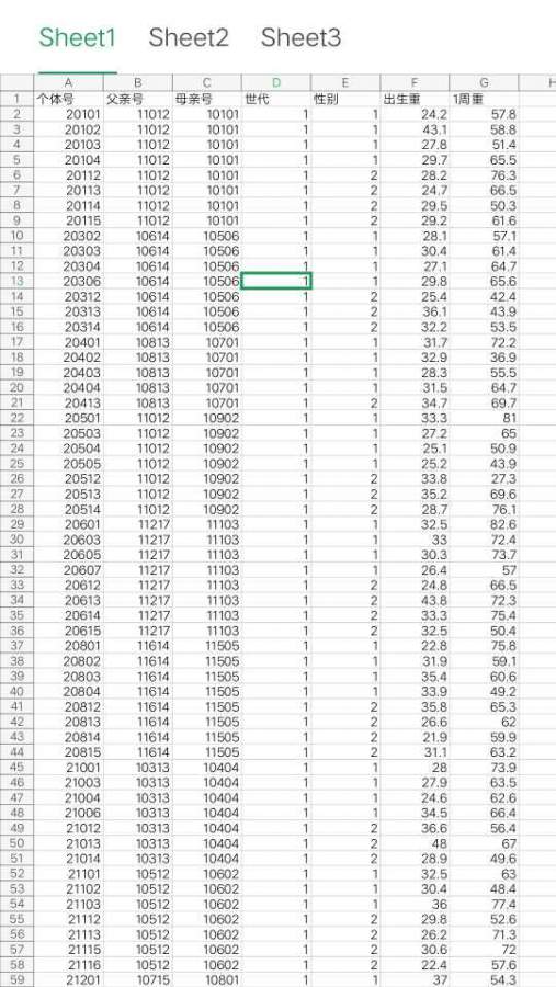 题目:根据所给出的鸡出生重和7日龄体重的数据,估计这两个性状的遗传参数,要求数据量最少包含100个有效数据。 数据: 个体号 父亲号 母亲号 世代 性别 出生重 1周重 20101 11012 10101 1 1 24.2 57.8 20102 11012 10101 1 1 43.1 58.8 20103 11012 10101 1 1 27.8 51.4 20104 11012 10101 1 1 29.7 65.5 20112 11012 10101 1 2 28.2 76.3 20113 11012 10101 1 2 24.7 66.5 20114 11012 10101 1 2 29.5 50.3 20115 11012 10101 1 2 29.2 61.6 20302 10614 10506 1 1 28.1 57.1 20303 10614 10506 1 1 30.4 61.4 20304 10614 10506 1 1 27.1 64.7 20306 10614 10506 1 1 29.8 65.6 20312 10614 10506 1 2 25.4 42.4 20313 10614 10506 1 2 36.1 43.9 20314 10614 10506 1 2 32.2 53.5 20401 10813 10701 1 1 31.7 72.2 20402 10813 10701 1 1 32.9 36.9 20403 10813 10701 1 1 28.3 55.5 20404 10813 10701 1 1 31.5 64.7 20413 10813 10701 1 2 34.7 69.7 20501 11012 10902 1 1 33.3 81 20503 11012 10902 1 1 27.2 65 20504 11012 10902 1 1 25.1 50.9 20505 11012 10902 1 1 25.2 43.9 20512 11012 10902 1 2 33.8 27.3 20513 11012 10902 1 2 35.2 69.6 20514 11012 10902 1 2 28.7 76.1 20601 11217 11103 1 1 32.5 82.6 20603 11217 11103 1 1 33 72.4 20605 11217 11103 1 1 30.3 73.7 20607 11217 11103 1 1 26.4 57 20612 11217 11103 1 2 24.8 66.5 20613 11217 11103 1 2 43.8 72.3 20614 11217 11103 1 2 33.3 75.4 20615 11217 11103 1 2 32.5 50.4 20801 11614 11505 1 1 22.8 75.8 20802 11614 11505 1 1 31.9 59.1 20803 11614 11505 1 1 35.4 60.6 20804 11614 11505 1 1 33.9 49.2 20812 11614 11505 1 2 35.8 65.3 20813 11614 11505 1 2 26.6 62 20814 11614 11505 1 2 21.9 59.9 20815 11614 11505 1 2 31.1 63.2 21001 10313 10404 1 1 28 73.9 21003 10313 10404 1 1 27.9 63.5 21004 10313 10404 1 1 24.6 62.6 21006 10313 10404 1 1 34.5 66.4 21012 10313 10404 1 2 36.6 56.4 21013 10313 10404 1 2 48 67 21014 10313 10404 1 2 28.9 49.6 21101 10512 10602 1 1 32.5 63 21102 10512 10602 1 1 30.4 48.4 21103 10512 10602 1 1 36 77.4 21112 10512 10602 1 2 29.8 52.6 21113 10512 10602 1 2 26.2 71.3 21115 10512 10602 1 2 30.6 72 21116 10512 10602 1 2 22.4 57.6 21201 10715 10801 1 1 37 54.3 21202 10715 10801 1 1 33.4 39.7 21203 10715 10801 1 1 34.9 42.4 21212 10715 10801 1 2 29.2 54.7 21213 10715 10801 1 2 29.7 47.1 21215 10715 10801 1 2 37.2 54.4 21216 10715 10801 1 2 32.1 56.2 21301 10917 11002 1 1 34.9 64.7 21302 10917 11002 1 1 22.5 65.5 21303 10917 11002 1 1 28.8 66.5 21304 10917 11002 1 1 25.4 40.2 21312 10917 11002 1 2 37 63.7 21313 10917 11002 1 2 34.1 58.7 21314 10917 11002 1 2 25.7 57.3 21315 10917 11002 1 2 19 47.6 21401 11115 11204 1 1 37.4 62 21402 11115 11204 1 1 26.4 56.4 21403 11115 11204 1 1 35.1 46.7 21412 11115 11204 1 2 31.6 62 21413 11115 11204 1 2 26.5 86.4 21416 11115 11204 1 2 32.4 76.7 21417 11115 11204 1 2 24.3 69.8 21501 11316 11404 1 1 27.4 67.1 21502 11316 11404 1 1 31 74.7 21503 11316 11404 1 1 33.9 50 21504 11316 11404 1 1 31.8 56.2 21512 11316 11404 1 2 33.7 61.5 21513 11316 11404 1 2 33.1 63.7 21601 11515 11603 1 1 34.6 47.2 21602 11515 11603 1 1 32.5 58.7 21603 11515 11603 1 1 33.4 45.9 21604 11515 11603 1 1 32.1 69.8 21612 11515 11603 1 2 25.3 51.4 21614 11515 11603 1 2 24.3 56.9 21615 11515 11603 1 2 29.4 57.4 21616 11515 11603 1 2 31.1 62.9 30201 20413 20304 2 1 26.4 61.3 30202 20413 20304 2 1 33.2 62.3 30203 20413 20304 2 1 35.4 55.4 30204 20413 20304 2 1 17.9 72.8 30212 20413 20304 2 2 26.9 46.4 30213 20413 20304 2 2 33.5 71.5 30215 20413 20304 2 2 34.4 58.5 30216 20413 20304 2 2 40.3 45.6 30301 20614 20503 2 1 22.2 62.1 30302 20614 20503 2 1 28 64.9 30303 20614 20503 2 1 31.3 71 30312 20614 20503 2 2 38.2 52.2 30401 20813 21503 2 1 24.1 62.9 30402 20813 21503 2 1 40.6 69.6 30403 20813 21503 2 1 30 52.9 30404 20813 21503 2 1 31.6 75 30412 20813 21503 2 2 30.4 59.6 30413 20813 21503 2 2 24.7 48.5 30414 20813 21503 2 2 25.7 65.4 30415 20813 21503 2 2 28 45.7 30601 21213 21101 2 1 23.8 57.4 30602 21213 21101 2 1 27 46 30603 21213 21101 2 1 35.2 61.5 30604 21213 21101 2 1 36.6 67.1 30612 21213 21101 2 2 34.8 66 30613 21213 21101 2 2 24 64.6 30701 21416 21303 2 1 28 54.9 30702 21416 21303 2 1 33 48.4 30703 21416 21303 2 1 29.1 64.3 30705 21416 21303 2 1 29.5 52.1 30713 21416 21303 2 2 29.4 60.6 30714 21416 21303 2 2 28.5 70.1 30715 21416 21303 2 2 23.8 69.8 30716 21416 21303 2 2 31.4 61.8 30801 21616 21501 2 1 24 61.2 30802 21616 21501 2 1 34.4 65.8 30812 21616 21501 2 2 29.1 53.7 30814 21616 21501 2 2 35.8 54.1 30815 21616 21501 2 2 28.5 49.7 30817 21616 21501 2 2 31.8 66.6 30901 20115 21004 2 1 24.3 53.6 30902 20115 21004 2 1 25.8 47 30904 20115 21004 2 1 25.1 73 30912 20115 21004 2 2 31.7 63 30913 20115 21004 2 2 24.5 61.5 30914 20115 21004 2 2 37.8 50.8 31101 20514 20607 2 1 32.4 46.4 31103 20514 20607 2 1 26.3 59.4 31105 20514 20607 2 1 32.9 66.9 31106 20514 20607 2 1 32.4 49.1 31201 21513 20801 2 1 34.6 65.8 31202 21513 20801 2 1 23.4 44.4 31203 21513 20801 2 1 27.2 78.5 31212 21513 20801 2 2 33.4 59.8 31213 21513 20801 2 2 35.9 67.8 31214 21513 20801 2 2 36 38 31301 20112 21003 2 1 33.8 51.3 31302 20112 21003 2 1 36.3 51.7 31304 20112 21003 2 1 22.6 58.4 31306 20112 21003 2 1 28.6 47.6 31312 20112 21003 2 2 32.7 58.7 31401 21113 21202 2 1 33.3 65.9 31402 21113 21202 2 1 38 72.3 31403 21113 21202 2 1 29.1 71.5 31404 21113 21202 2 1 31.7 57.4 31412 21113 21202 2 2 25.1 60.8 31414 21113 21202 2 2 27.6 56.7 31415 21113 21202 2 2 21.1 60.7 31416 21113 21202 2 2 30.3 74.4 31501 21315 21401 2 1 21.9 58.8 31502 21315 21401 2 1 35 55.1 31504 21315 21401 2 1 31 54 31505 21315 21401 2 1 33.2 62.6 31512 21315 21401 2 2 25.5 71.6 31513 21315 21401 2 2 25.5 62.1 31514 21315 21401 2 2 26.9 66.3 31601 21512 21602 2 1 17.5 44.4 31602 21512 21602 2 1 39.3 55.1 31603 21512 21602 2 1 35.5 67.2 31604 21512 21602 2 1 24.7 50.3 31612 21512 21602 2 2 29.4 58.4 31613 21512 21602 2 2 36.5 70.3 31614 21512 21602 2 2 26.6 76.5 31616 21512 21602 2 2 29.5 56.3 40101 30213 30904 3 1 33.2 66.6 40102 30213 30904 3 1 26.9 68.2 40103 30213 30904 3 1 34.1 51.6 40113 30213 30904 3 2 25.5 72.4 40115 30213 30904 3 2 42 53.4 40116 30213 30904 3 2 34.8 54.2 40117