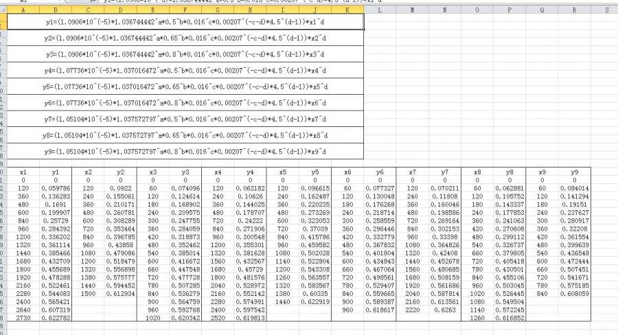 1stOpt程序如下 Parameter a[0,3],b[0,3],c[0,3],d[0,1]; Constant x1(1:18)= [0, 120, 360, 480, 600, 840, 960, 1200, 1320, 1440, 1680, 1800, 1920, 2160, 2280, 2400, 2640, 2730]; y1(1:18)= [0, 0.059786033, 0.136282684, 0.169100437, 0.199906649, 0.257290213, 0.284391903, 0.336201569, 0.361113937, 0.385465639, 0.432708835, 0.455688618, 0.478288263, 0.522461286, 0.544082725, 0.565421389, 0.60731883, 0.62278162]; //x2(1:15)= [0, 120, 240, 360, 480, 600, 720, 840, 960, 1080, 1200, 1320, 1380, 1440, 1500]; //y2(1:15)= [0, 0.092200061, 0.155061401, 0.210170689, 0.260781153, 0.308289484, 0.353463558, 0.396784536, 0.438579873, 0.479085569, 0.518479044, 0.556898081, 0.575777365, 0.594452478, 0.612934006]; //x3(1:18)= [0, 60, 120, 180, 240, 300, 360, 420, 480, 540, 600, 660, 720, 780, 840, 900, 960, 1020]; //y3(1:18)= [0, 0.074095981, 0.124614089, 0.16890231, 0.209575081, 0.247754843, 0.284058695, 0.318873317, 0.352461869, 0.385014009, 0.416672319, 0.447547529, 0.477727876, 0.507285167, 0.536278858, 0.564758913, 0.592767844, 0.620342221]; //x4(1:18)= [0, 120, 240, 360, 480, 720, 840, 960, 1200, 1320, 1560, 1680, 1800, 2040, 2160, 2280, 2400, 2520]; //y4(1:18)= [0, 0.063182385, 0.106259682, 0.144024692, 0.178706772, 0.242219695, 0.271906472, 0.300547767, 0.355300661, 0.381628262, 0.432567145, 0.457290356, 0.481575584, 0.528972027, 0.552141505, 0.574991224, 0.597542104, 0.619812723]; //x5(1:16)= [0, 120, 240, 360, 480, 600, 720, 840, 960, 1080, 1140, 1200, 1260, 1320, 1380, 1440]; //y5(1:16)= [0, 0.096615319, 0.16248695, 0.220235301, 0.273269388, 0.323052788, 0.37039015, 0.415785673, 0.459582497, 0.502027922, 0.52280375, 0.543307863, 0.563557151, 0.583566703, 0.603350074, 0.622919498]; //x6(1:17)= [0, 60, 120, 180, 240, 300, 360, 420, 480, 540, 600, 660, 720, 780, 840, 900, 960]; //y6(1:17)= [0, 0.077327153, 0.130048252, 0.176267792, 0.218714218, 0.258558921, 0.296445909, 0.332778725, 0.367832004, 0.401803676, 0.434842539, 0.467064153, 0.498560604, 0.529406827, 0.559664873, 0.589386885, 0.618617227]; //x7(1:17)= [0, 120, 240, 360, 480, 720, 840, 960, 1080, 1320, 1440, 1560, 1680, 1920, 2040, 2160, 2220]; //y7(1:17)= [0, 0.070210713, 0.118079874, 0.160045816, 0.198585885, 0.269163905, 0.302153002, 0.333980317, 0.364825566, 0.424080103, 0.452677926, 0.480685362, 0.508158752, 0.561685703, 0.587814201, 0.613561021, 0.626299665]; //x8(1:18)= [0, 60, 120, 180, 240, 360, 420, 480, 540, 660, 720, 780, 840, 960, 1020, 1080, 1140, 1260]; //y8(1:18)= [0, 0.062880602, 0.105752145, 0.143336775, 0.177853199, 0.241062761, 0.270607742, 0.299112235, 0.32673719, 0.379805458, 0.405417622, 0.430501037, 0.455106161, 0.503044813, 0.526445453, 0.549504264, 0.572244844, 0.616852258]; //x9(1:15)= [0, 60, 120, 180, 240, 300, 360, 420, 480, 540, 600, 660, 720, 780, 840]; //y9(1:15)= [0, 0.084013663, 0.141293577, 0.191509739, 0.237626525, 0.280916615, 0.322079706, 0.361554235, 0.399638585, 0.436547801, 0.472443548, 0.507451379, 0.54167134, 0.575184848, 0.60805932]; Function For(i=1:18)(y1=(1.0906*10^(-5)*1.036744442^a*0.5^b*0.016^c*0.00207^(-c-d)*4.5^(d-1))*x1^d); //For(i=1:15)(y2=(1.0906*10^(-5)*1.036744442^a*0.65^b*0.016^c*0.00207^(-c-d)*4.5^(d-1))*x2^d); //For(i=1:18)(y3=(1.0906*10^(-5)*1.036744442^a*0.8^b*0.016^c*0.00207^(-c-d)*4.5^(d-1))*x3^d); //For(i=1:18)(y4=(1.07736*10^(-5)*1.037016472^a*0.5^b*0.016^c*0.00207^(-c-d)*4.5^(d-1))*x4^d); //For(i=1:16)(y5=(1.07736*10^(-5)*1.037016472^a*0.65^b*0.016^c*0.00207^(-c-d)*4.5^(d-1))*x5^d); //For(i=1:17)(y6=(1.07736*10^(-5)*1.037016472^a*0.8^b*0.016^c*0.00207^(-c-d)*4.5^(d-1))*x6^d); //For(i=1:17)(y7=(1.05104*10^(-5)*1.037572797^a*0.5^b*0.016^c*0.00207^(-c-d)*4.5^(d-1))*x7^d); //For(i=1:18)(y8=(1.05104*10^(-5)*1.037572797^a*0.65^b*0.016^c*0.00207^(-c-d)*4.5^(d-1))*x8^d); //For(i=1:15)(y9=(1.05104*10^(-5)*1.037572797^a*0.8^b*0.016^c*0.00207^(-c-d)*4.5^(d-1))*x9^d); |
