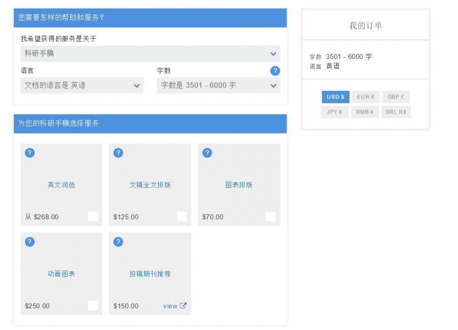 服务是手稿,如果润色语言就选择英语,翻译选中文。如果是润色服务下面还要选择是标准润色还是高级润色。