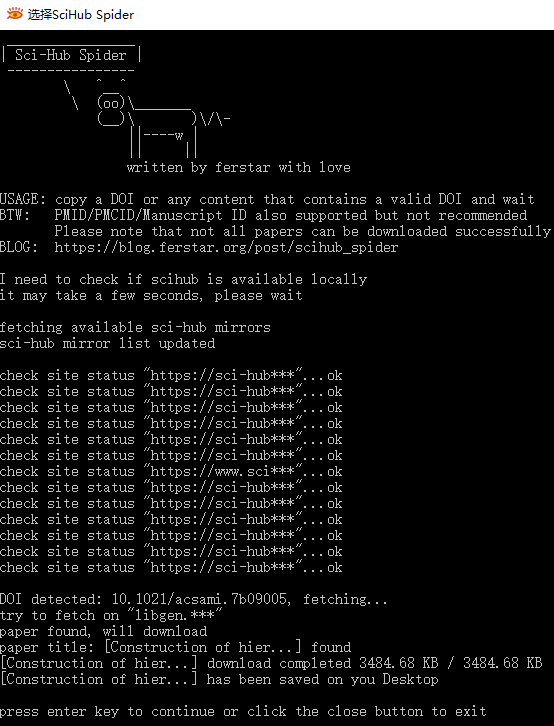 花时间写了一个Sci-Hub文献下载工具,叫"Sci-Hub Spider",这个工具可以帮你做以下事情: 1. 自动检测当前可用Sci-Hub站点 2. 自动检测你目前网络环境对可用Sci-Hub站点的连通性 3. 自动探测剪贴板内容,当你复制了一个文章的DOI号后会自动去libgen或Sci-Hub检索该文章的全文下载链接 4. 自动将该文章全文下载到桌面 使用很简单,找到需要下载文章的DOI或者PMID号,复制,然后工具会自动检索并下载该文章全文 具体细节请见我的博客:https://blog.ferstar.org/post/scihub_spider/ Sci-Hub Spider网盘链接(觉得好用请打赏,打赏二维码在网盘有放,谢谢): 链接:https://pan.baidu.com/s/1boAEC4f 密码:dz4y 截图: SCI-Hub: 科研分享,知识无界, 让我们一起消除科学的障碍。 如对您有所帮助,请收藏并推荐给需要的朋友。 原网盘分享莫名其妙被度娘和谐,正好SciHub貌似更新网站,旧版本不再可用,所以顺便做了新的适配,增加软件自动更新功能,弃用百度网盘。有需要的同学烦请更新下。 下载地址:SciHub-Spider-update-1.6.4 [ Last edited by ferstar on 2018-1-12 at 12:01 ] 新附件在此[ Last edited by ferstar on 2018-1-12 at 12:03 ] |