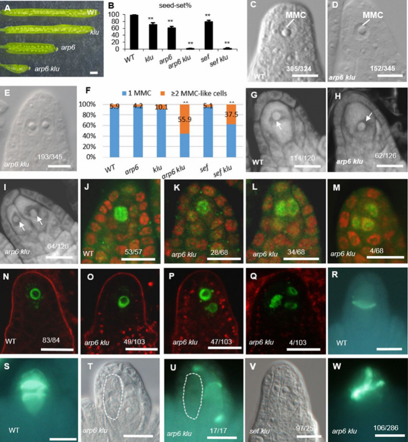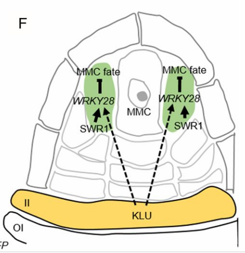 生殖细胞系的分化是有性生殖发育的关键过程。在大多数开花花植物的胚珠中,仅有一个亚表皮细胞扩大并分化形成大孢子母细胞(MMC),大孢子母细胞会进一步减数分裂和有丝分裂产生大孢子囊中的多种细胞。 然而,目前大孢子母细胞在产生过程中是如何与周围细胞产生功能分化的机制上不明确。该研究团队研究发现一个WRKY家族的转录因子WRKY28.其在围绕MMC周围的体细胞中特异表达,并参与抑制这些细胞获得类MMC的特性。以上结果表明WRKY28是抑制MMC周围细胞向生殖细胞转化的重要因子。 进一步研究发现ACTINRELATED PROTEIN 6 (ARP6)蛋白与细胞色素P45家族基因KLU相互作用同样影响MMC周围细胞的命运。在arp6 klu双突变体中,MMC周围细胞出现了MMC的部分特征基因的表达。KLU是一个心皮原基表达的酶,因此可能存在长距离信号调控MMC周围细胞的命运,进而使得MMC的细胞命运最终局限于一个细胞。 |
