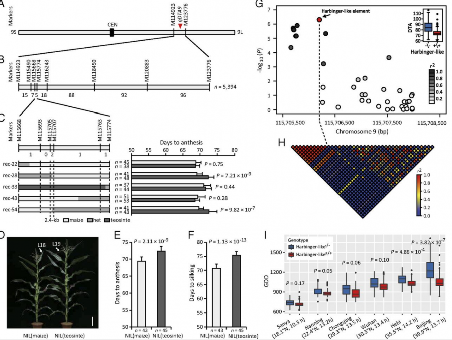 玉米起源于热带的墨西哥西南部,在美洲地区广泛分布,这与作物难以跨纬度扩散的规律相不符。玉米如何适应不同纬度的气候环境,在很大程度上是未知的。该研究通过图位克隆和关联分析,发现一个控制开花时间的数量性状基因座位于CCT转录因子基因(ZmCCT9)上游57 kb处的Harbinger-like转座元件。该元件通过顺式作用抑制ZmCCT9的表达,从而促进长日照条件下玉米的开花。CRISPR/Cas9敲除ZmCCT9可使长日照条件下玉米开花提前。ZmCCT9为日间型调节,其负调控成花素基因ZCN8的表达,从而导致长日照条件下玉米开花出现延迟。群体遗传学分析表明,ZmCCT9中Harbinger-like转座子的插入和另一个CCT同源基因ZmCCT10中CACTA类转座子的插入,引起了其后的演化过程,并经由选择以使玉米适应高纬度地区。该研究结果有助于解释在前哥伦布时期,转座子丰富的玉米基因组如何使玉米适应不同纬度的地区。 开花时间是作物适应当地环境的关键决定因素。作为自然和人工选择的结果,玉米已经进化成为降低了光周期敏感性,适应美洲90°以上纬度地区。在这里,我们展示了一个distant Harbinger-like转座子,作为一个顺式调控元件抑制ZmCCT9表达,以促进在高纬度长日照条件下的开花。ZmCCT9上的转座子和第二个开花时间基因ZmCCT10上的另一功能性转座子,在驯化后依次出现,并被选择为玉米从热带向高纬度传播的靶标。我们的研究结果表明,由转座子插入产生的新的功能变异,帮助玉米迅速在广泛的纬度范围内传播。 从墨西哥西南部的热带起源,玉米已遍布在美洲的广阔的纬度。这项壮举,违背了作物禁止在纬度上轻易扩散的规则。玉米如何完成广泛维度的适应,在很大程度上是未知的。通过定位克隆和关联作图,我们将一个开花时间的数量性状基因座定位到CCT转录因子(ZmCCT9)上游57kb处的Harbinger-like转座元件。长日照条件下,Harbinger-like转座元件通过顺式作用来抑制ZmCCT9表达,从而促进开花。通过CRISPR/Cas9敲除ZmCCT9,可在长日照条件下引起早开花。ZmCCT9受昼夜调节,负调控成花素ZCN8的表达,从而导致在长日照条件下的晚花。群体遗传学分析表明,插入在ZmCCT9中的Harbinger-like转座子,以及插入在另一个CCT旁系同源物,ZmCCT10中的CACTA-like转座子,在驯化后依次出现,并被选择为玉米从热带向高纬度传播的靶标。我们的研究结果有助于解释,在前哥伦布时代,具有转座子活动丰富的动态玉米基因组是如何使玉米适应超过90°的纬度地区的。 |