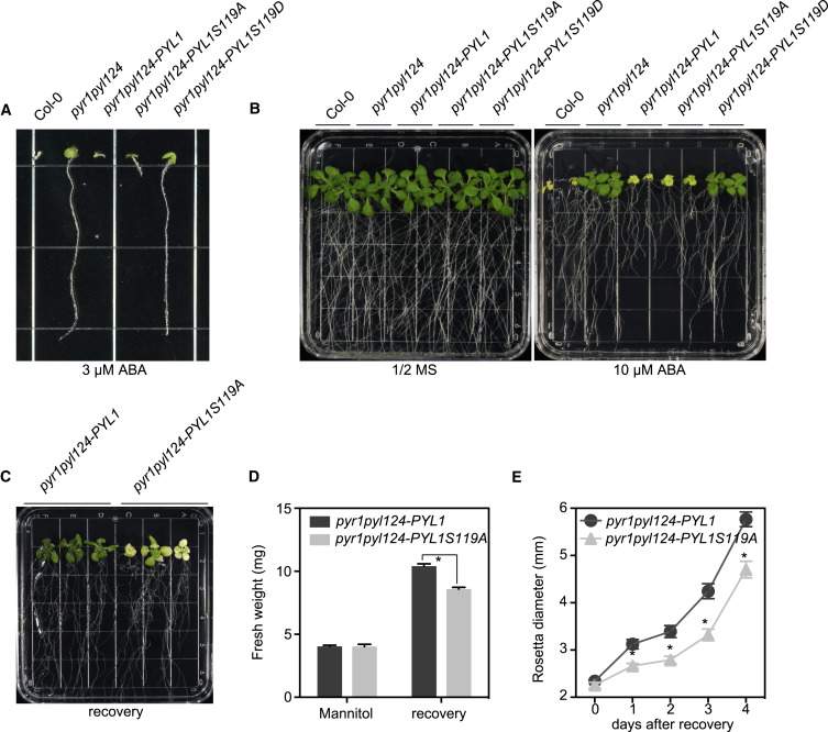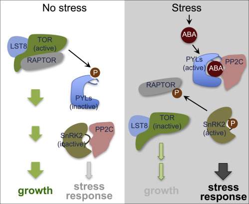 该研究揭示了植物雷帕霉素靶蛋白(Target of Rapamycin, TOR)激酶和脱落酸(Abscisic Acid, ABA)受体偶联的信号途径间通过相互磷酸化修饰,介导植物生长发育和胁迫应答的平衡。 由于无法通过移动有效地逃避胁迫,植物必须精确地平衡生长发育和胁迫应答,以适应不断变化的环境。在干旱等胁迫来临时,植物需要抑制生长发育并激活胁迫应答过程以维持生存;在胁迫条件解除后,植物又需要及时解除胁迫反应并恢复生长。已知植物激素ABA在逆境胁迫应答过程有关键作用,但对于植物平衡生长发育和胁迫应答的分子机制仍不清楚。在这一研究工作中,逆境中心研究人员揭示了TOR蛋白激酶和ABA受体偶联途径间的相互调控是这一平衡过程中的关键机制。 基于定量磷酸化蛋白组学分析,逆境中心的研究人员发现ABA 受体PYR1/PYLs 蛋白存在一个保守的磷酸化位点,ABA 抑制这一位点的磷酸化。外源ABA 处理后,PYL蛋白中这一位点的磷酸化消失。通过点突变模拟这一位点的磷酸化发现磷酸化的PYL蛋白不能结合ABA,也不能抑制PP2C 的活性,失去感受和传递ABA 信号的功能。非磷酸化形式的的PYL转基因植物的恢复生长(Recovery Growth)与野生型相比明显延迟。研究人员进一步发现TOR 能特异地磷酸化PYL 蛋白这一位点。已知TOR 蛋白高等生物中非常保守的,控制细胞能量代谢、细胞生长和发育过程的关键因子。tor 突变体以及TOR 复合体组分突变体raptor 等对ABA 敏感,并在正常条件下表现出生长抑制、SnRK2 活性增加、胁迫应答基因表达等胁迫类似表型。同时,TOR 复合体中的调节组分RaptorB 是ABA受体下游核心蛋白激酶SnRK2 的底物。胁迫条件下ABA激活SnRK2 蛋白激酶,并通过磷酸化RaptorB 蛋白,促进TOR复合体的解离,抑制TOR的活性。这一研究发现ABA 受体的磷酸化调控机制,并发现TOR 蛋白激酶复合体和ABA 受体偶联途径组成的调节环(loop)平衡植物生长发育和胁迫应答的分子机理。 |