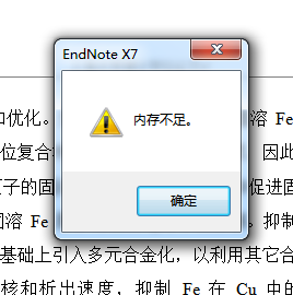 endnote X7插入新文献后,会显示作者和发表年代,点击update citations and bibliography可以恢复到参考文献格式,原来一直这么弄的。不知道什么时候起,点击会一直弹出内存不足的提示,无法下一步操作。电脑内存应该是够的。求解答。 QQ图片20180115145715.png |