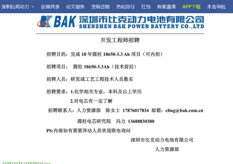 欢迎海内外硕博投身电池龙头行业—比克电池 招聘岗位: 项目开发工程师 岗位需求 项目开发工程师 录用要求 o 博士或硕士学历; o 男、女不限; o 需有相关课题研究并有著作发表,国家重点院校/科研院所毕业优先录用; o 国内外知名锂电企业、分析或研究机构和著名院校科研机构相关工作经验优先考虑; 涉及专业 o电化学、物理化学、高分子化学、有机化学、无机化学、材料物理化学、应用化学、化学工程与工艺、流体力学、化工原理、新能源材料与器件、热力学、计算机模拟仿真、机械设计类、智能控制、电子信息/工程、测控技术等相关专业; 岗位方向 o 锂电池材料体系或工艺开发方向、锂电池性能或安全机理研究方向、动力电池结构/电子/测试、全固态电池方向; o 电芯设计、工艺开发、设备维护开发、电池产品开发 426421253345150634.png [ 来自版块群 广东 ] |