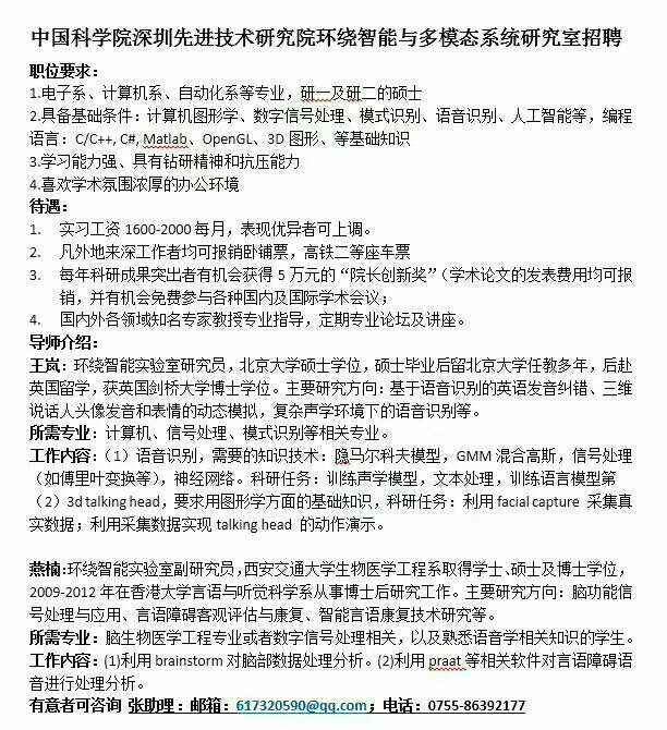 专业:计算机、电子、自动化相关,有计算机图形学基础优先。 硕士实习待遇1600-2000,支持学生发论文参加国际会议,发论文的版面费可以报销。 具体情况见下图 发自小木虫Android客户端 |
