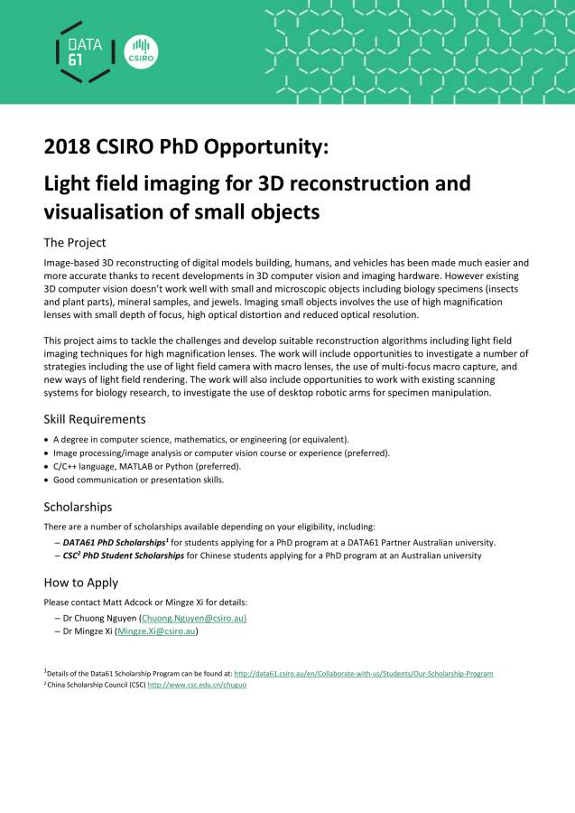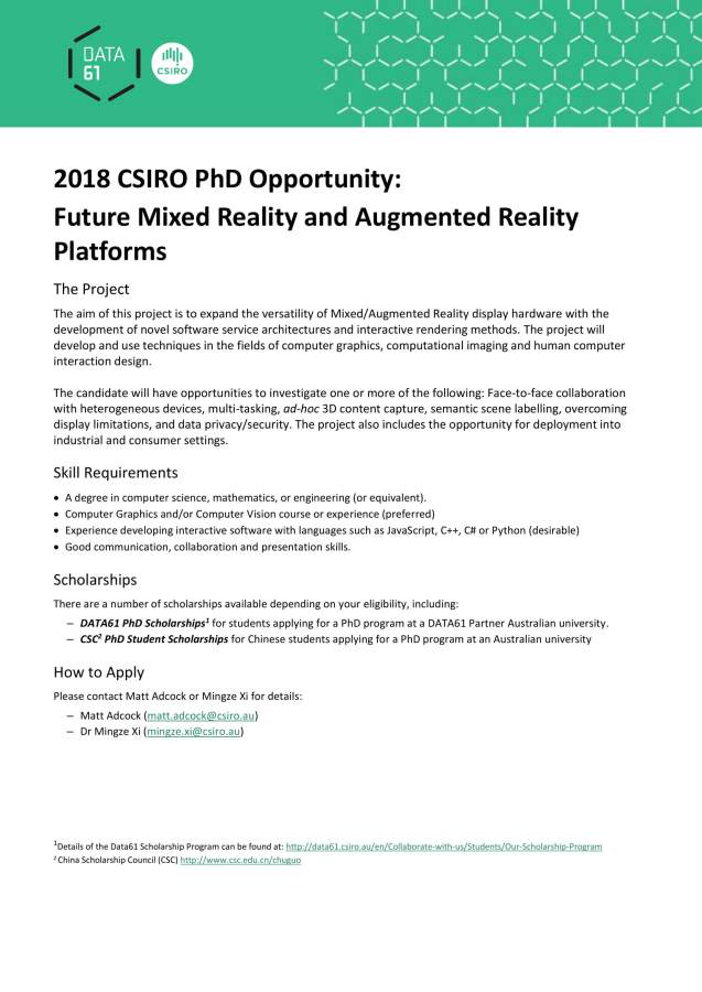 CSIRO Immersive Environments Lab位于CSIRO堪培拉总部,拥有世界一流设施。现在招收CSC资助的博士生以及联培博士生。 除CSC资助外,CSIRO Data61也拥有自己的全额博士奖学金项目。 Please send your CV to mingze.xi@csiro.au 2018CSC-Data61_1.jpg 2018CSC-Data61_2.jpg 2018CSC-Data61_3.jpg |