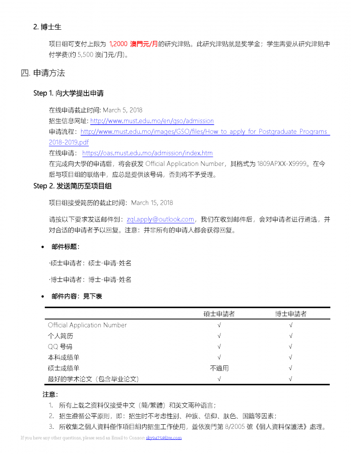 详情请见附件之PDF档,简历请按要求电邮至zql.apply@outlook.com ************************** 請注意:請同學們下載 附件 2:lastest_Enroll_info_2018.pdf ,此爲最新版本的招生説明。因收到的简历数量太多,且农历新年将至,项目组无充足的时间为大家举行面试。所以希望大家先行向大学申请,然后持学校所分配的 Official Application Number (e.g., 1809APXX-X9999)再向项目组投递简历,我们将于3月为符合资格之申请者安排面试。 请注意: 1. 向澳門科技大學提出硕士/博士申请不会占用大陆的报考/调剂名额(即我校和大陆学校可并行报考/调剂); 2. 大学硕士/博士申请的截至日期是:March 5, 2018 3. 在今后与项目组的联络中,应总是提供Official Application Number号码,否则将不予受理。 ************************** |