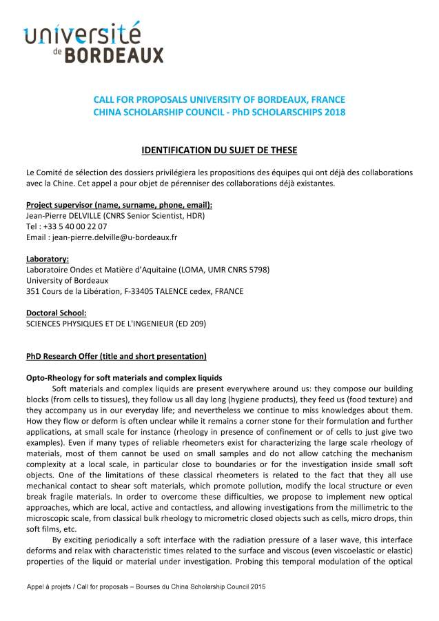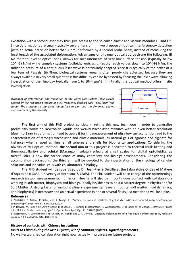 法国 外导Prof. Delville 招生csc博士,课题与光学研究液体流变性能,有光学和softmaterials背景最好。其他也可考虑。详情请邮件外导。 详情见附件图片。 外道风趣幽默,为人谦和,科研严谨。 截至日期2月28之前。有意向请尽快与他直接联系。 0001.jpg 0002.jpg 0003.jpg 0004.jpg |