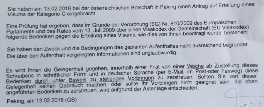 各位大神,我4月份去维也纳开会,现在先帮老婆申请去奥地利的签证,但是大使馆回信是德语的,有没有哪位可以帮忙解读一下啊(原文见附件图片)!