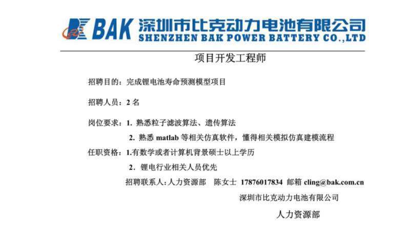 欢迎海内外硕博投身电池龙头行业—比克电池 招聘岗位: 项目开发工程师 岗位需求 项目开发工程师 录用要求 o 博士或硕士学历; o 男、女不限; o 需有相关课题研究并有著作发表,国家重点院校/科研院所毕业优先录用; o 国内外知名锂电企业、分析或研究机构和著名院校科研机构相关工作经验优先考虑; 涉及专业 o电化学、物理化学、高分子化学、有机化学、无机化学、材料物理化学、应用化学、化学工程与工艺、流体力学、化工原理、新能源材料与器件、热力学、计算机模拟仿真、机械设计类、智能控制、电子信息/工程、测控技术等相关专业; 岗位方向 o 锂电池材料体系或工艺开发方向、锂电池性能或安全机理研究方向、动力电池结构/电子/测试、全固态电池方向; o 电芯设计、工艺开发、设备维护开发、电池产品开发 图片.jpg [ 来自版块群 广东 ] |