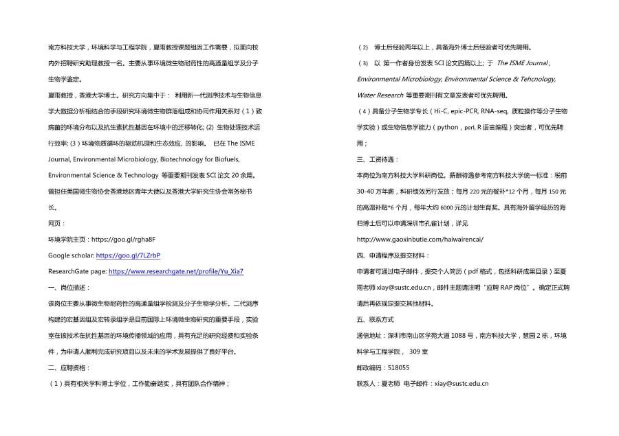 南方科技大学夏雨教授诚聘研究助理教授一名,详情请见附件。