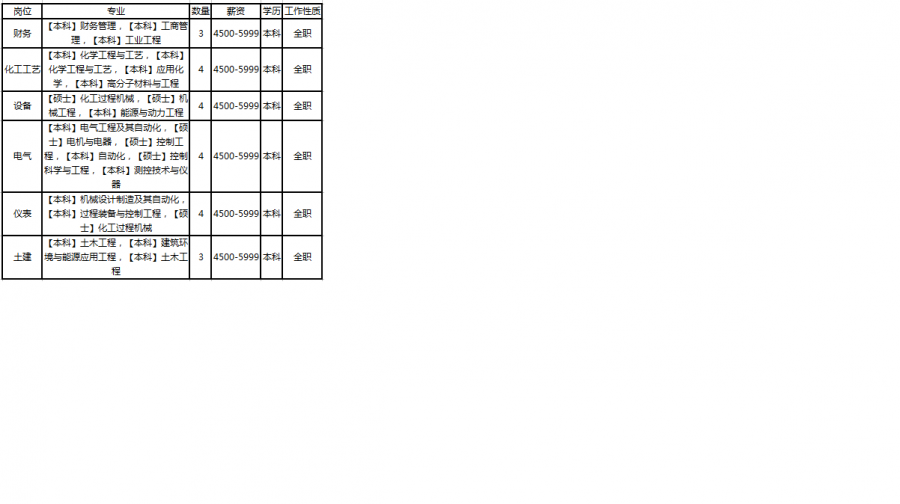 公司简介 利和知信新材料技术有限公司成立于2017年7月,控股股东是任丘市利和科技发展有限公司,技术支撑单位是北京利和知信科技有限公司。任丘市利和科技发展有限公司专门从事聚烯烃催化剂和助剂的研发、制造和销售,已申请的海内外发明专利40余篇,其中13篇已经授权;公司于2009年通过科技部组织的高新技术企业认证,并先后通过了ISO 9001质量体系认证、ISO18000职业安全卫生管理体系认证、ISO14001环境管理体系认证;公司的聚烯烃催化剂产品已长周期、稳定地应用于中石化、中石油、中国神华、台塑集团、中煤能源、中国大唐等国内知名企业,并远销海外市场,国内气相聚丙烯工艺市场占有率第一,为聚烯烃行业增效、技术升级、产品开发做出突出贡献。 利和知信新材料技术有限公司目前在沧州渤海新区新材料园投资50.6亿元,新建80万吨/年高性能树脂项目。 岗位 专业 数量 薪资 学历 工作性质 财务3人:要求 全职,学历本科,专业:财务管理,工商管理,工业工程,待遇:4500-5999/月; 化工工艺:4人,要求全职,学历本科,专业:化学工程与工艺,化学工程与工艺,应用化学,高分子材料与工程,待遇:4500-5999/月 设备 :4人,要求全职,学历硕士/本科,专业:化工过程机械【硕士】,机械工程【硕士】,【本科】能源与动力工程,待遇:4500-5999/月 电气 :4人,要求全职,学历本科及以上,专业:电气工程及其自动化,电机与电器,控制工程,【本科】自动化,【硕士】控制科学与工程,【本科】测控技术与仪器 仪表 :4人,要求全职,学历本科及以上,专业:机械设计制造及其自动化,过程装备与控制工程,化工过程机械 土建 :3人,要求全职,学历本科及以上,专业:土木工程,建筑环境与能源应用工程,土木工程 联系方式 联系人:刘进凯 电话:0317-2616193-621 E-mail:13833717773@126.com 无标题.png [ 来自版块群 河北 ] |