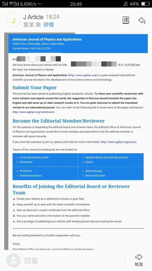 收到一封据称来自American Journal of Physics and Applications刊的邮件,说对我去年发表的一篇文章很感兴趣,并建议我翻译成英文投到他们刊,求助:1、我不知道这是真的还是假的,这个刊倒是真实存在的,链接也是对的;2、但是我的文章已经发表过了,再投不是有问题吗? 发自小木虫Android客户端 |
