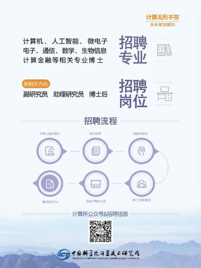 研究所介绍: 中国科学院计算技术研究所(简称计算所)创建于1956年,是中国第一个专门从事计算机科学技术综合性研究的学术机构,被誉为中国计算机事业的摇篮。计算所不仅在历史上为两弹一星、石油勘探等重大任务做出过巨大贡献,孕育出联想、曙光等著名企业,还诞生了一批新时代的成果和品牌:龙芯、AVS、天玑、晶上、寒武纪、中科视拓…… 2017年,计算所计算机体系结构国家重点实验室在信息领域国家重点实验室评估中获得优秀, 所承办的中国科学院大学计算机学科在全国第四轮学科评估中获得A+。计算所集中在计算机系统、网络与智能技术三个主要研究领域,专注人才培养、学术研究、技术创新、技术应用与技术转移。诚招杰出人才,共创美好未来。 招聘岗位&专业: 招聘专业方向包括但不限于: 人工智能、计算机系统结构、网络等学科方向,具体包括: 计算机视觉、机器学习、自然语言处理、机器人、计算机体系结构与高性能计算、云计算、大数据、社会计算、移动计算、生物信息学、计算金融、无线通信、互联网体系结构以及相关交叉学科方向。 招聘岗位及在线应聘 https://app.mokahr.com/campus_apply/ict#/?_k=dsw5v6 计算所青年人才引进海报-1.jpg 计算所青年人才引进海报-2.jpg [ 来自版块群 北京 ] |