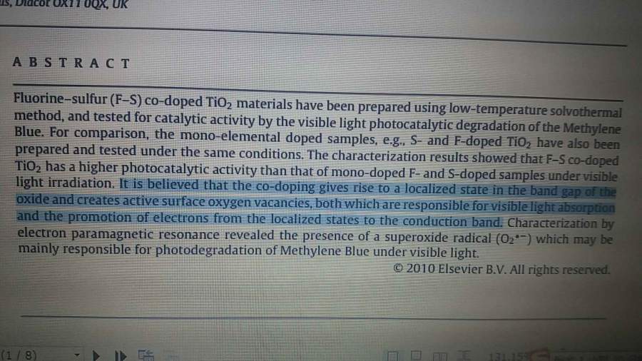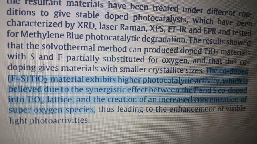 1.共掺杂使氧化物的带隙中产生局域态,并提供活跃的表面氧空位。这两方面与可见光吸收及电子从局域态到导带的跃迁有很大关系。 2.共掺杂的(F-S)TiO2材料具有更高的光催化活性,这是由于共掺杂进TiO2晶格中的F和S之间的协同效应,以及超氧化物种浓度的升高。 |