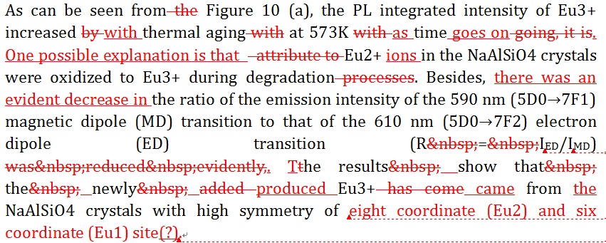 | As can be seen from the Figure 10 (a), the PL integrated intensity of Eu3+ increased by thermal aging with at 573K with time going, it is attribute to Eu2+ in the NaAlSiO4 crystals were oxidized to Eu3+ during degradation processes. Besides, the ratio of the emission intensity of the 590 nm (5D0→7F1) magnetic dipole (MD) transition to that of the 610 nm (5D0→7F2) electron dipole (ED) transition (R = IED/IMD) was reduced evidently, the results show that the newly added Eu3+ has come from NaAlSiO4 crystals with high symmetry of eight coordinate (Eu2) and six coordinate (Eu1) site. |