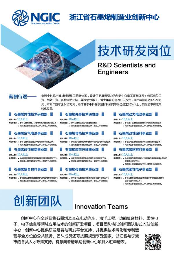 人才招聘启事 浙江省石墨烯制造业创新中心是根据《中国制造2025浙江行动纲要》、《浙江省制造业创新中心建设工程实施方案》、《宁波市人民政府关于宁波市推进“中国制造2025”试点示范城市建设的若干意见》指示精神,在宁波市推进“中国制造2025”工作领导小组的统一领导下,在浙江省、宁波市经济和信息化委员会具体指导下,由中国科学院宁波材料技术与工程研究所(以下简称宁波材料所,https://www.nimte.ac.cn/)牵头并联合我国石墨烯行业骨干企业、产业链上下游企业、投资基金、产业资本以及中国石墨烯产业技术创新战略联盟等十余家单位共同出资成立的独立企业法人的石墨烯产业技术创新平台——宁波石墨烯创新中心有限公司,注册资本1亿元,落户于宁波新材料初创产业园(https://www.nbstartup.cn/)。 创新中心按照《中国制造2025》规划制定的石墨烯产业技术发展路线图,重点面向电动汽车、海洋工程、功能复合材料、电子信息和柔性电子等领域对石墨烯及其改性材料的重大需求,定位于突破技术成熟度4-6级的石墨烯产业前沿技术和关键共性技术,打通石墨烯基础研究与产业需求间缺失的关键创新环节,为石墨烯产业提供成套与系统性技术解决方案,并通过融合各创新要素完成向下游的技术转移扩散,实现首次商业化,促进传统产业转型升级和先导产业培养发展。 创新中心秉持“宁波小核心、长三角大平台、全国大网络”的发展思路,充分依托中国科学院宁波材料技术与工程研究所、长三角区域高校/科研院所以及石墨烯行业骨干企业等的石墨烯技术研究开发、测试分析公共平台以及人才资源优势,着力建设服务于石墨烯产业技术创新的研发设计中心、测试评价中心、中试开发基地、行业服务基地,打造完善的石墨烯技术创新链、产业链系统和跨界协同创新生态系统。 创新中心目标是建成具有国际领先水平、引领石墨烯技术创新和产业发展的国家级石墨烯制造业创新中心,到2020年,初步建成功能完备的国家级石墨烯制造业创新中心,总建筑面积达到3万平米,规模达到150人,培育孵化石墨烯企业20家以上。到2025年,创新中心总建筑面积达到5万平米,规模达到300人,培育孵化石墨烯企业50家以上。 现因创新中心业务发展需要,经研究,拟面向社会公开招聘管理岗位和研发岗位人员一批,欢迎有志之士加盟,招聘工作将本着公开、公平、竞争、择优的原则,报名人员经资格审核合格后,组织面试考核,择优聘用。有意者请将应聘材料通过电子邮件发送给姚女士邮箱smxcxzx@163.com,邮件标题为“应聘岗位-姓名”。 联系人:姚老师 联系方式:86685020 邮箱:smxcxzx@163.com 石墨烯创新中心招聘启事 [ 来自版块群 浙江 ] |