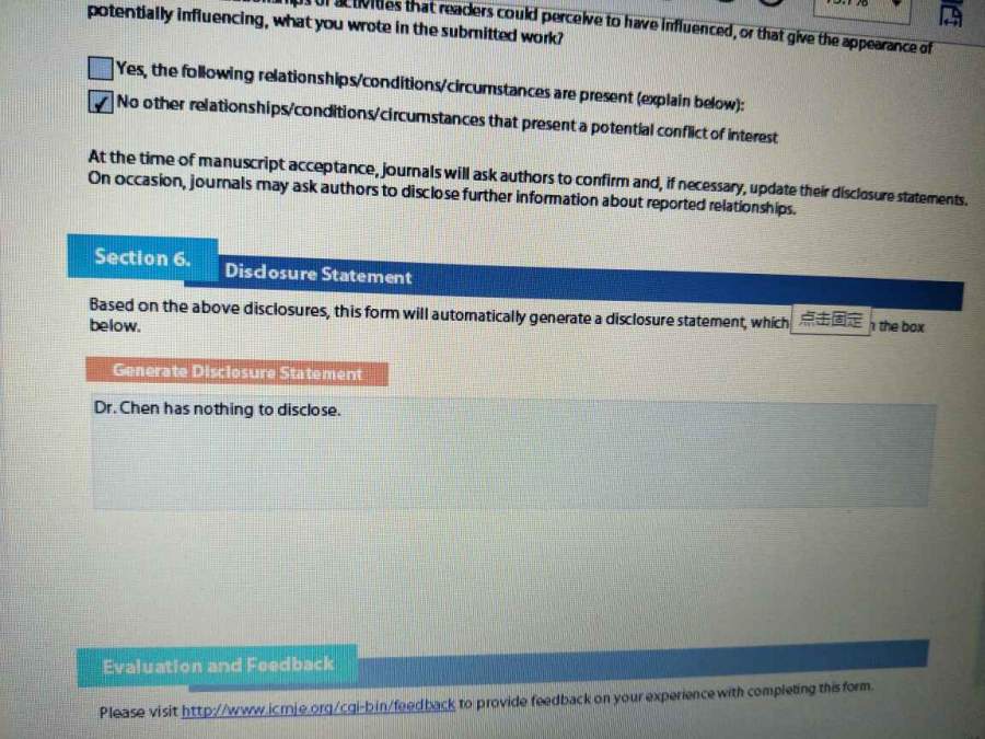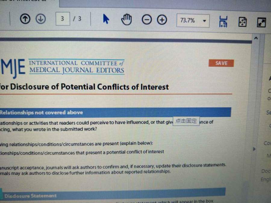 关于这个杂志的作者利益冲突Conflict of interest statement ,终于整明白啦 投稿一天就sent back,说是利益冲突的格式不对,还写了具体建议,这次我又仔细研读,这个杂志的要求是:网上下载ICMJE格式的利益冲突,用Adobe Arobat reader 这个pdf阅读器打开,一共6部部分,每个作者填一份,前5部分填好之后,第六部分点generate disclosure statement 就自动生成,最后点上面有个save(可以看图片),就成功啦,然后打印下来,每个作者签一份,再扫描成图片.jpg格式上传就OK啦,祝我的经验帮到你们 发自小木虫Android客户端 |