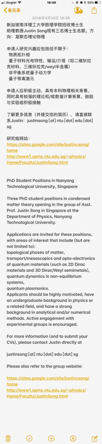 新加坡南洋理工凝聚态理论物理博士招生