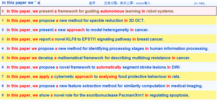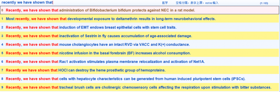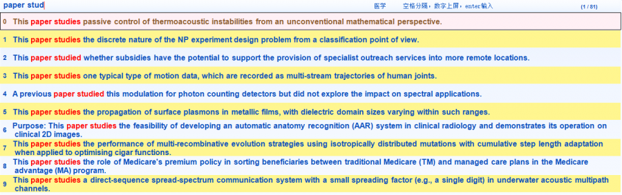 今天给大家介绍一款英文科技论文写作神器——句易英文论文输入法。 句易英文论文输入法是专门为研究生和科技工作者设计的英语科技论文写作辅助软件。 句易英文论文输入法是全球首款支持多单词输入查询例句、一键输出句子的英文输入法,拥有数十亿句地道的英美科技英语句库,支持通配符、字段限定、权重调整等高级检索,精准查找例句。 使用这款句易英文论文输入法,只要会拼写单词,就能轻轻松松写出地道的学术英语句子,英文论文写作效率大大提升。 大家在写英文论文时,可能会有这样的体验:不知道怎样写句子或不确定词组的搭配用法时,会去Google Scholar、COCA、Ludwig、Linggle、Netspeak等网站搜索相关例句和用法。但是,这是一项非常费时费力的工作,为了查找和改写例句,需要反复在Google Scholar等网站和word之间切换奔波,效率非常低。 句易英文论文输入法完全不需要来回切换,因为它是输入法,可以直接在word中使用! 只要输入几个关键单词,就能得到海量英文例句作为参考,选择最有用的例句(也可直接根据例句改写句子),一键输出句子到word。 使用句易输入法,可以访问“句易数据”官网(www.scijuyi.com),在首页点击“下载句易输入法”进行下载。也可以使用网页版体验,但没有输入法方便好用。 句易英文论文输入法安装文件不大,3M多。下载后进行安装。因为需要在系统中安装输入法,Windows系统防火墙和用户账户控制会提示是否允许修改输入法设置,选择是和允许就可以了。 在安装过程中会提示选择句库,包含有医学、生命科学、数学电子计算机、物理学、化学材料、环境食品农林渔、机械自动化与建筑、地球科学与地理学、工程技术等句库,选择一个你所需的句库就可以了。 安装过程中,可以对按键进行设置。默认是空格键分隔单词、数字键上屏、Enter键直接输入。 安装完后,用微信扫码登录就可以使用了。 在没有登录句易英文论文输入法之前,输入法悬浮窗口显示为“请登录” 点击“请登录”,自动跳转到登录网页,使用微信扫描二维码进行登录。 扫描成功后,在您的微信上会显示: 并且您的句易输入法会显示已登录状态: 输入法悬浮窗中“句”代表句易英文论文输入法状态,如果“句”变成“E”代表纯英文输入状态,可以用Shift键切换。 现在可以使用句易英文论文输入法了! 先来看看最基本的功能,下面以“医学”句库为例。 我们在写论文时,经常要写一个句子“本论文研究了……”,你只需在句易输入法中输入paper stud(最后一个单词study可以不输全),就可以得到相关的例句(翻页可以查看更多结果): 如果你认为序号为2的例句对你有参考价值,按下数字键“2”,这一句“This paper studied whether subsidies have the potential to support the provision of specialist outreach services into more remote locations.”就会输入到您正在使用的文字编辑软件中(Word、WPS、记事本等)。你可以参考一个或多个例句,对其进行改写,直到写出符合你论文的、真正属于你的句子。 你也可以继续输入单词,直到写出满意的句子,然后按enter键,将句子输入到Word等文字编辑软件中。 句易英文论文输入法还有一个很贴心的功能:记忆上一次输入并选择了例句的单词或词组。 例如,我们输入recently we have shown that 只要我们选择了任何一句例句。在我们下一次输入任何一个字母时,输入法悬浮框就会显示一行小字“recently we have shown that”,即前一次输入的词组。 只要我们用鼠标点击“recently we have shown that”,就会出现上次检索结果。 句易输入法还有一些更高级的用法,例如:支持通配符、字段限定、权重调整。 使用*表示通配符。(注意:*与单词之间需要用空格分隔,且不能以*号结尾) 例如,在写论文中,我们经常会写这样一个句子:在本文中,我们介绍/描述/报道/提出/证实/讨论了一个...... 那么,介绍/描述/报道/提出/证实/讨论 应该用什么单词呢?我们可以在输入法中输入:in this paper we * a 多翻几页,就可以知道常用的句型有: In this paper we present a…… In this paper we propose a…… In this paper we report a…… In this paper we develop a…… In this paper we show a…… In this paper we introduce a…… In this paper we describe a…… In this paper we validate a…… In this paper we discuss a…… 用引号可以对字段进行限定查询。例如,您想查询used the method,您可以输入:”used the method。返回的结果将严格按照单词顺序,排除the method was used这类例句。 增加权重。在输入单词前加上^字符,可以增加此单词的权重,查询结果将优先返回包含更多此单词的例句。 句易英文论文输入法具有三大优点。 第一,只要输入单词就可以输出例句,支持多种高级查询方式,更精准查找例句。 第二,一键输出例句到word等文字编辑软件。 第三,例句都是经挑选过的比较地道的英美学术英语例句,可放心作为模版改写和模仿。 目前,句易输入法登录后可以免费使用100句。但是,可以通过转发微信朋友圈,增加免费使用次数,基本上可以免费使用到写完一两篇SCI论文。当然,长期使用可以充值。目前包年活动优惠价是19元/年(原价120元/年)。 |