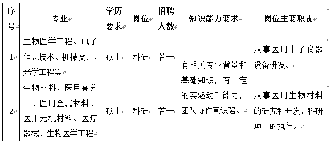 一、 招聘岗位(有效期3个月) 二、单位简介 广东省医疗器械研究所,是隶属于广东省科学院的骨干科研院所。主要围绕数字诊疗设备、视觉虚拟治疗、智能康复辅助器具、组织工程产品、新型植介入医疗器械、人工器官等领域开展基础与应用基础研究、共性技术及工程化研究、成果转移转化、技术服务、人才培养等工作,解决预防、诊断、治疗、康复过程中的临床需求问题,是集科、工、贸一体,产、学、研、医、商相结合的事业型科研院所。 广东省医疗器械研究所始建于1977年,总部位于广州天河区,有3300平方米的研发大楼及10380平方米的医疗器械工程化基地。建有:国家医疗保健器具工程技术研究中心、广东省医用电子仪器及高分子材料制品重点实验室、广东省老年痴呆诊断与康复工程技术研究中心、广东省质量监督医疗保健器具检验站、广东省质量监督体育用品检验站、动物实验室等国家及省级创新平台;同时主办《临床医学工程》杂志。 根据所发展的规划及科研工作需要,现在生物医学材料、医疗仪器设备等方向招聘研究开发人员,欢迎致力于医疗大健康事业的人员加盟我所,共同推动我国高端医疗器械产业快速发展。 三、薪酬待遇 年薪10万 四、报名方式 1、报名:应聘者将有关应聘资料投递至邮箱:LLZ1106@126.com ,邮件标题格式为:姓名+专业方向(电子/材料)。 2、材料要求:须提交个人简历、毕业证、学位证、论文、成果等相关证明材料的复印件或原件。 3、资格审查:根据招聘岗位的要求,对应聘资料进行审查甄别,择优遴选拟聘人员,电话通知面试时间。 4、报名时间:2018年5月-2018年7月 5、面试时间:2018年5月开始不定期进行面试。 五、联系方式 单位名称:广东省医疗器械研究所 邮 编:510500 电 话:020-37228272 陈老师、曾老师 地 址:广州市天河区广州大道中1307号 网 址:https://www.gdmii.com、https://www.nerchd.com 邮 箱:LLZ1106@126.com [ 来自版块群 广东 ] |