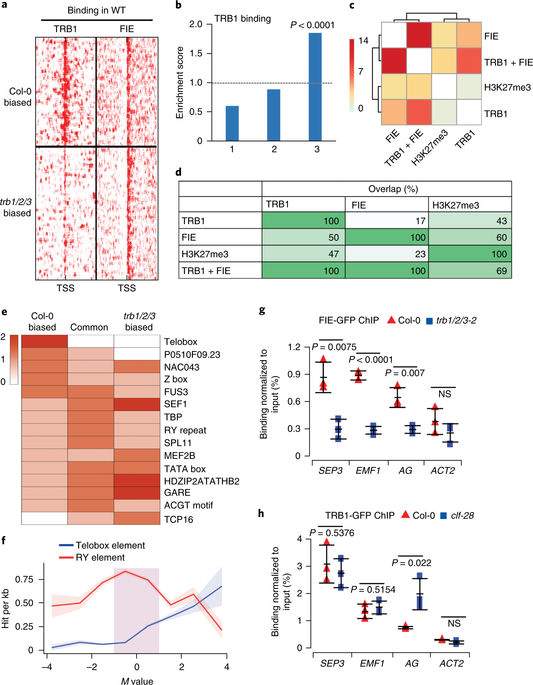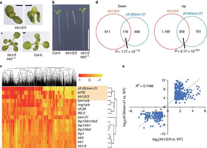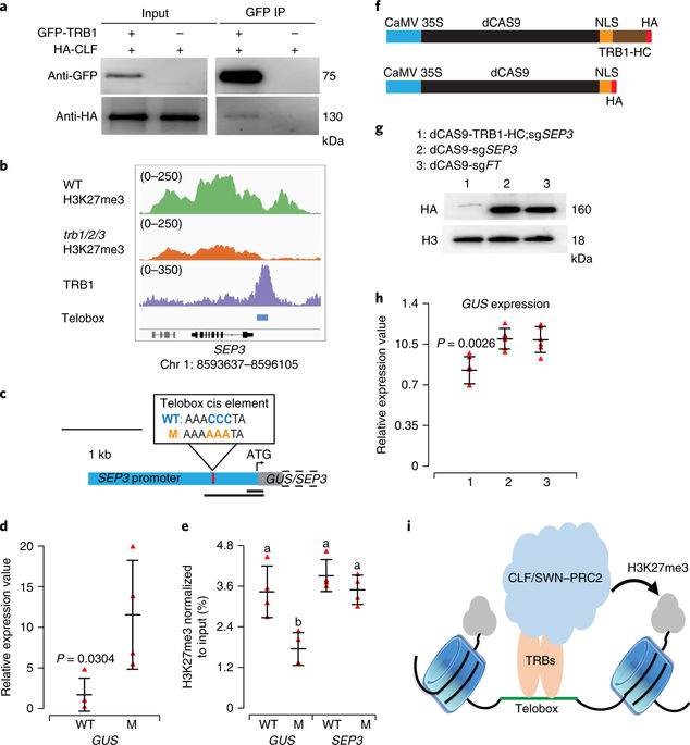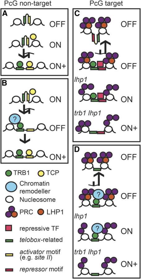 在高等真核生物中,多梳抑制复合物PRCs通过表观基因抑制控制着器官的发育。PcG(Polycomb-group proteins)复合体介导的H3K27me3表观修饰在动植物组织特异性发育过程中都具有重要的调控作用。但是其特异性招募机制还不清楚,尽管已有个别位点和协同作用转录因子被报道,但是是否存在相对广谱的招募机制仍然不清楚。该论文研究表明在全基因组范围内,端粒重复结合因子(TRBs)通过结合telobox基序招募PRC2到靶基因上的机制,为探索PRCs是如果被招募到染色质上提供了一种新的机制。 PRC蛋白并不含有DNA结合结构域,因此PRCs是如何结合到其靶基因位点的还是一个有待解决的问题。本文报道了拟南芥中端粒重复结合因子TRB通过telobox基序招募PRC2。trb1-2、trb2-1和trb3-2三突变体的表型和转录组与PRC2突变体较为相似,两者均显示H3K27me3的再分配以及低水平的H3K27me3,这与TRB1靶基因的去阻遏相关。TRB1–3能够与PRC2蛋白CLF和SWN相互作用。一个带有telobox突变的SEP3报告基因显示出异位表达,这与H3K27me3的耗尽相关,会将TRB1紧紧拴在突变了的顺式作用元件上,部分恢复抑制作用。作者假设telobox基序通过TRBs与CLF/SWN之间的相互作用招募PRC2,该机制能够促进H3K27me3在一些靶基因上的沉积。 一般认为PcG蛋白介导的抑制基因沉默的作用机制如下:首先,PRC2复合物在基因组区域(PRC反应元件,PRE)上的组蛋白H3赖氨酸27位加上三个甲基基团的修饰(即H3K27me3),该修饰是转录沉默的染色质标记。之后PRC1复合体结合H3K27me3后,修饰该位点的组蛋白H2A上的119位赖氨酸上单泛素化(H2AK119Ub1)。这两种修饰结合后,能够改变染色质的结构,进一步抑制PcG靶位基因的表达。PRCs需要以稳定而有选择性的方式招募到DNA目标上,以确保灵活在不同时期调控不同基因的表达。由于在PRC2蛋白核心复合体中没有能直接结合DNA的亚基,因此研究PRC2蛋白是如何被招募到DNA目标上是该领域的最重要问题之一,也是该领域的研究前沿。现在已发现有以下三种模式能够将PRCs蛋白复合体招募到特定的基因上:a, TF结合到特定的DNA序列上后再招募PRCs复合体;b, PRCs能够结合被甲基化修饰的组蛋白;c, 通过结合RNA被招募。 从遗传学与高通量数据挖掘揭示telobox结合蛋白TRBs(Telomere Repeat Binding Proteins)与telobox基序招募PcG的潜在作用。以此为基础,通过进一步合作,本项目在全基因组尺度揭示TRBs通过结合telobox基序招募PRC2到靶基因的分子机制。与已报道的PcG特异性招募因子相比,TRB是一个具有广谱招募PcG复合体的蛋白家族。trb1/2/3三突变体与PcG强突变体的表型和表达模式都高度类似(图A)。在三突变体中,H3K27me3发生了大范围重排(图B),H3K27me3下调的区域与TRB1结合位点及telobox所在区域高度重叠(图C,D)。进一步实验证据表明TRB1-3可以与PcG的核心催化酶CLF和SWN相互作用;而且,TRB1和PcG的共同靶基因SEP3的启动子上telobox突变后异位表达,并伴随H3K27me3水平下调,而导入TRB1则可以部分恢复抑制状态。综上,TRBs首先结合telobox基序,然后通过TRBs和CLF/SWN之间的相互作用招募PRC2蛋白介导靶基因的H3K27me3修饰,进而抑制靶基因的表达(图F)。该论文研究表明在全基因组范围内,端粒重复结合因子(TRBs)通过结合telobox基序招募PRC2到靶基因上的机制,为探索PRCs是如果被招募到染色质上提供了一种新的机制。 |
