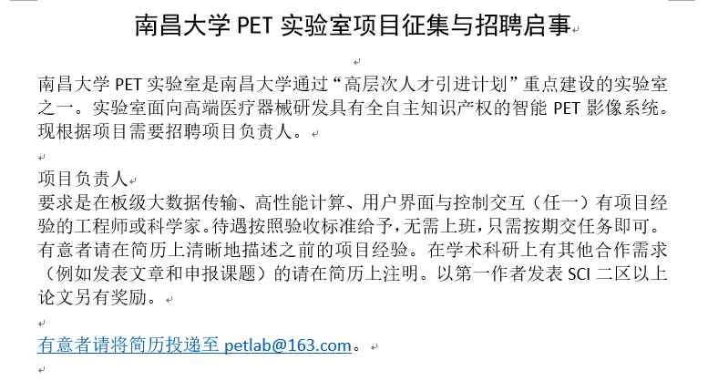 有意者请将简历投递至petlab@163.com。 发自小木虫Android客户端 |
