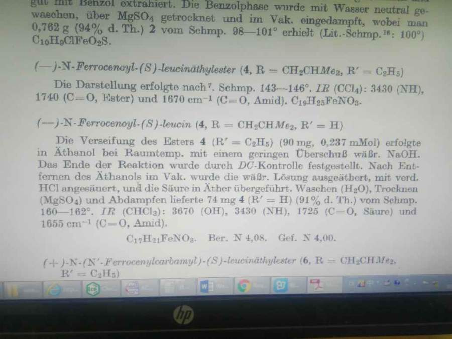 (-)-N-二茂铁酰基-(S)-亮氨酸 (4,R=CH2CHMe2,R'=H) 室温中,将酯4(R'=C2H5)(90 mg,0.237 mMol)于乙醇中与稍过量的含水NaOH进行皂化。 通过TLC对照确定反应终点。真空除去乙醇后,用乙醚提取的含水溶液用稀HCl酸化,再将 酸转化为乙醚。洗涤(H2O),干燥(MgSO4),然后蒸发浓缩得到74mg的4(R'=H)(91%理论收 率)熔点160-162℃。 IR (CHCl3):3670 (OH), 3430(NH),1725(C=O, 酸) 和 1655 cm-1 (C=O, 酰胺)。 C17H21FeNO2,计算值N 4.08, 实测值N 4.00。 |