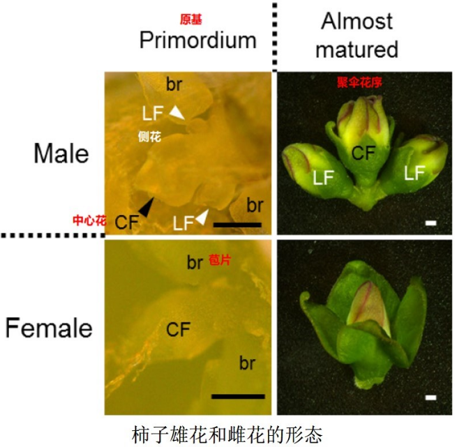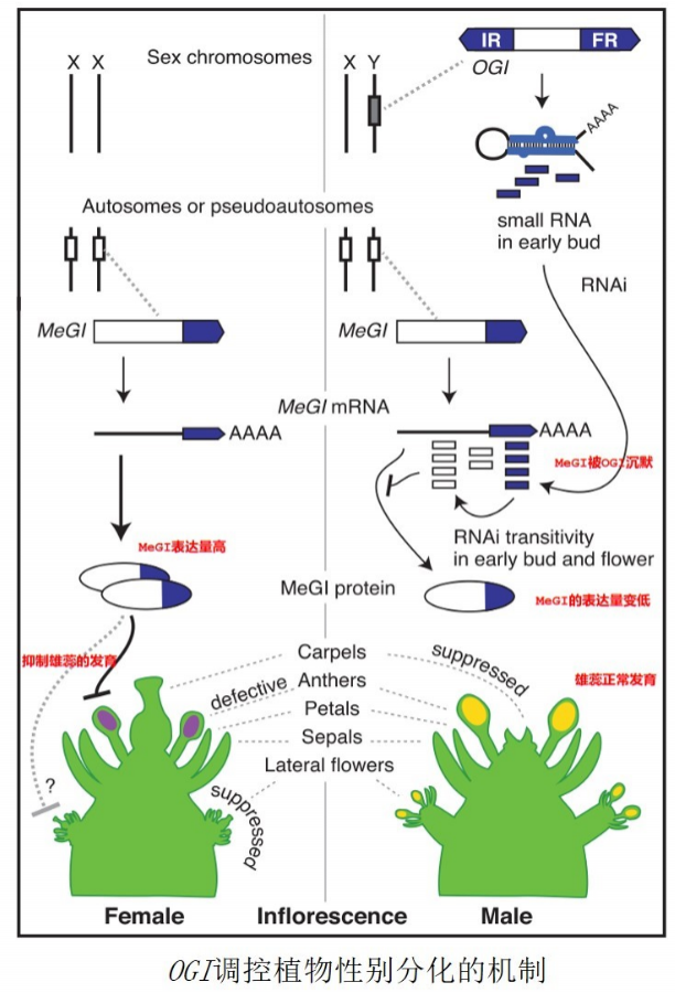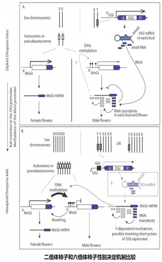 现代遗传学和进化学的观点认为,性别分化是遗传多样性和物种演化的源泉。在动物和人类中,对性染色体的鉴定和研究揭示了性别演化的机制。然而,大多数雌雄异株植物的性染色体还没有被鉴定,我们对植物性别演化的机制还所知甚少。早在2014年,Shy Girl 这篇文章的作者,就和美国加州大学戴维斯分校的研究者合作,在Science上发表了一篇题为《A Y-chromosome–encoded small RNA acts as a sex determinant in persimmons》的文章。在这篇文章中,研究人员以柿子为实验材料,使用基因组测序和转录组测序技术,并结合进化学分析,鉴定到了一个定位在Y染色体上的同源异型结构域转录因子(homeodomain transcription factors)家族基因OGI。有意思的是,OGI的编码区有多个提前终止的突变,说明它很可能不具有转录因子的活性。进一步的序列分析发现,OGI序列具有一个发夹结构,并且和另外一个基因MeGI具有很高的序列相似性。而一般认为,发夹结构是小分子RNA的标志性结构,暗示着OGI可能具有小分子RNA的功能。MeGI位于常染色体上,是通过转录组分析鉴定到的一个差异表达基因,在发育中的雌花中表达量很高,在雄花中却很低,也属于同源异型结构域转录因子家族。 在拟南芥和烟草中异源表达MeGl基因,会抑制雄蕊的发育,影响花粉萌发,导致雄性不育,但是对雌蕊的发育没有影响。并且,在烟草叶片中过表达OGI会抑制MeGI的表达。进一步研究发现,OGI编码的21bp的小RNA在雄性花的蓓蕾中表达丰富;同时,起源于MeGI的小RNA的含量也很高,而在雌性花中的表达极低。以上结果说明,MeGI的高表达会导致雄性不育,而Y染色体上的OGI编码的小RNA,通过RNA沉默机制抑制MeGI的表达,恢复雄性花中雄蕊的育性。和Shy Girl基因抑制雌蕊发育的机制不同,OGI对植物性别分化的调控属于表观遗传学的范畴。和许多其他的生物学现象一样,性别分化也越来越多地从表观遗传学的角度得到了合理的解释。值得一提的是,近日,浙江万里学院葛楚天、钱国英团队在Science杂志上发表了题为 “The histone demethylase KDM6B regulates temperature-dependent sex determination in a turtle species” 的研究论文,在爬行动物温度依赖型性别决定研究领域取得重要进展,揭示了组蛋白去甲基化酶KDM6B调控红耳龟温度依赖型性别决定的分子机理,解开了温度依赖型性别决定研究长达半个世纪的谜团。 按照“双突变模型”,至少需要两个突变才能导致雌雄性别的分化,一个突变导致雄性不育,一个突变导致雌性不育。遗憾的是,在本研究中科研人员并没有找到导致雌性不育的基因。不过,在后续的研究中,研究人员在猕猴桃中发现Shy Girl基因可抑制雌蕊的发育。由于植物Y染色体起源和性别分化机制的多样性,这两种性别决定机制在各种雌雄异株植物中是不是保守的,我们还不得而知。要解释清楚植物的性别演化,仍然还有很长的路要走。让我们共同期待科研人员后续精彩的研究吧。 在Science文章的解读中我们提到,二倍体柿子为雌雄异株,它们可分为两种性别:雌株,只开雌花,染色体为XX;雄株,只开雄花,染色体为XY。而二倍体柿子的近亲六倍体柿子则不同,它们的性别有点乱,也分为两种:雌株,只开雌花,染色体为XXXXXX;雌雄同株,既有雌花也有雄花,染色体组成为XXXXYY或者XXXXXY。也就是说,和二倍体柿子不同,在六倍体柿子中,含有Y染色体的植株上既有雌花也有雄花。这到底是什么原因导致的呢?按照Science文章中的结论,影响二倍体柿子性别分化的因素有两个,Y染色体上的假基因OGI和常染色体上的基因MeGI。那么这两个基因在六倍体柿子中的状态是什么样的呢?研究人员首先检测了雌花和雄花中MeGI基因的表达情况,发现雌花中MeGI基因的表达量很高,而雄花中的表达量却很低;并且雄花中由MeGI衍生的小RNA很多,雌花中则几乎检测不到,这和二倍体柿子中的情况是一样的。另外,在六倍体柿子MeGI基因的启动子和编码区域只找到了2个SNP位点,并且这两个位点都没在基因的关键区域。以上结果说明,MeGI基因对花的性别的影响,在二倍体和六倍体柿子中是保守的。在二倍体柿子中,Y染色体上的OGI基因编码的小RNA在雄花中高表达,降低MeGI的含量,使雄蕊正常发育。那么,是不是六倍体柿子的OGI出现了什么差错呢?令人吃惊的是,在六倍体柿子的雄花中,竟然检测不到OGI的表达。并且二者中OGI的序列相似性达到96%,都有相似的发夹结构,暗示着他们具有相同的功能。那么,到底是什么导致OGI不表达呢?进一步研究发现,在OGI的启动子区域有一个268bp的片段插入,它是一个SINE (short interspersed nuclear element)-like反转座子原件,将其命名为Kali。Kali处表现出较高的甲基化程度,抑制了OGI的表达。 按照二倍体柿子中的理论,既然OGI基因无法表达,那么染色体组成为XXXXYY或者XXXXXY的植株中MeGI的表达都应该很高,都应该为雌花才对,那么雄花是如何产生的呢?研究发现,在MeGI的启动子和基因序列上,一共发现了三个甲基化区域,并且雄花中的甲基化程度要远远高于雌花。同时,MeGI的甲基化会以某种未知的方式使smMeGI累积,这就导致了雄花中MeGI mRNA被降解,使雄蕊正常发育。进一步用甲基化抑制剂处理雄性花蕾后发现,雄蕊的发育被抑制,雌蕊的发育被促进。以上结果说明,六倍体柿子中,MeGI对花性别的影响,是受其甲基化水平调控的。至此,六倍体柿子中,表观遗传水平对花性别的决定机制已逐渐清晰:在雌株中(XXXXXX),MeGI基因的表达量