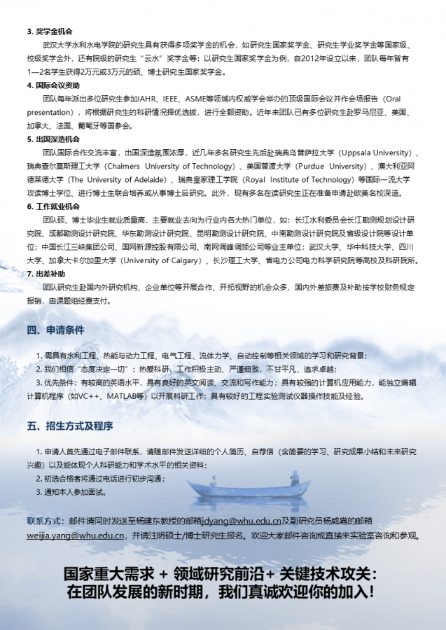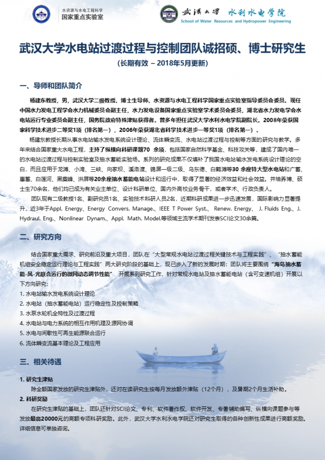 武汉大学团队诚招水利、动机、电气、控制方向硕、博士研究生(长期有效)