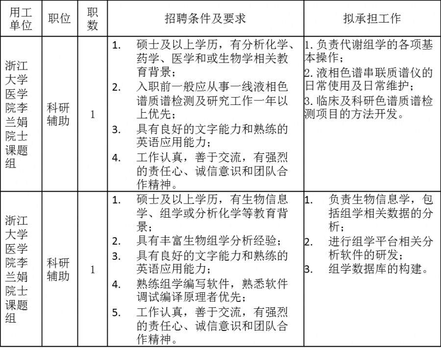 浙江大学医学院李兰娟院士课题组招聘科研技术人员2名
