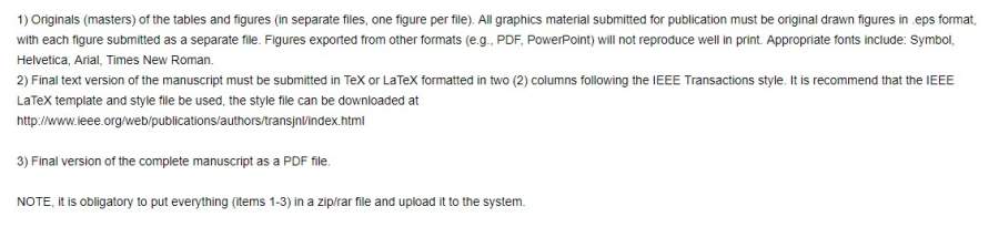 小弟最近有幸中了一篇IEEE Communications letters文章,编辑现在让我提交最终版本,有以下的几点疑问,希望有经验的虫友帮我解答以下,小弟不胜感激! 1. 如图所示,第一条我没太看明白,意思是原始的表格和图片。图片以eps格式上传,这个我能理解,但是表格怎么单独放在一个文件里呢? 2.最终提交内容分为三块:eps图片(如果表格不需要单独上传的话)、LaTex版本、pdf版本。把这个三个压缩成一个压缩文件上传,但是,我有一个问题。最终的形式是不是这样的:eps图片放在同一个文件夹里、LaTeX放在同一个文件夹里,pdf单独一个文件。 我的疑问是:这个LaTex只是自己编写的那个XXX.tex文件,还是说是一个包括图片和.tex的文件,因为我们正常写论文的时候,都需要把图片和这个XXX.tex文件放在同一个文件夹下面,这样,点开这个XXX.tex文件后,编译后才会生成pdf文件。 3.我看之前有人发帖说,上传最终文件时,原来的版本删不掉,那么我是不是不需要删除原来的版本,直接上传最终版本就行了。 小弟第一次文章被录用,请大家多多指点!谢谢大家! Snipaste_2018-07-20_21-34-11.jpg@Monash2011 |