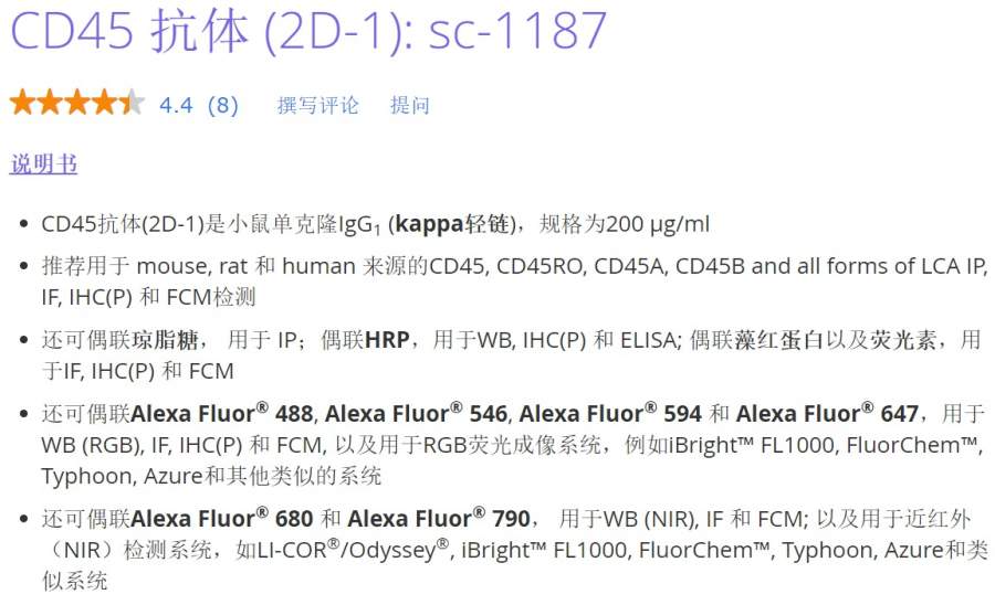 如图,这个抗体应该从小鼠身上生产的,为什么不止对小鼠起作用,还对人和大鼠起作用啊,因为CD45结构相似吗? 小鼠单克隆IgG1 (kappa轻链),是指这个抗体只有kappa轻链部分吗? 为什么都用kappa轻链,而不用lambda轻链呢? 无标题.jpg |