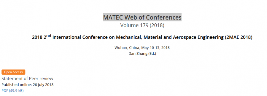 2018第二届机械、材料和航空航天工程国际会议(2MAE2018)成功出版