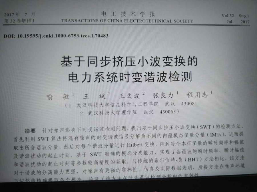 Power System Time-Varying Transient Harmonics Detection Based on SWT Accession number: 20173904205065 Authors: Yu, Min 1 ; Wang, Bin 1 ; Wang, Wenbo 2 ; Zhang, Liangli 1 ; Cheng, Yongzhi 1 Author affiliations : 1 College of Information Science and Engineering, Wuhan University of Science and Technology, Wuhan; 430081, China 2 School of Science, Wuhan University of Science and Technology, Wuhan; 430065, China Corresponding author: Wang, Bin (binwang907@163.com) Source title: Diangong Jishu Xuebao/Transactions of China Electrotechnical Society Abbreviated source title: Diangong Jishu Xuebao Volume: 32 Issue date: July 30, 2017 Publication Year: 2017 Pages: 50-57 Language: Chinese ISSN: 10006753 CODEN: DIJXE5 Document type: Journal article (JA) Publisher: Chinese Machine Press Abstract: In this paper, a new method for time-varying harmonic detection in the noisy interference background is put forward using synchrosqueezed wavelet transform (SWT). Firstly, the SWT algorithm is applied to decompose the time-varying harmonic signal mixed with noise into a series of intrinsic mode type functions (IMTs), then extracts the harmonic, the instantaneous amplitue, instantaneous frenquency and the starting and ending time of harmonic disturbance are obtained applying Hilbert transform to IMTs. The harmonic parameters are gained precisely by Hilbert transform based on the accurate mode seperation ability of SWT. The proposed SWT method has higher harmonic extration precision for multiple harmonic signals and better robustness against noise compared to traditional HHT. The simulation and real data tests show that the proposed method can extract each mode accurately in the noisy environment, and the validity of the proposed method is verified by time-varying harmonic dection. © 2017, The editorial office of Transaction of China Electrotechnical Society. All right reserved. Number of references: 26 Main heading: Harmonic analysis Controlled terms: Harmonic distortion - Wavelet transforms Uncontrolled terms: Harmonic detection - Hilbert Huang transforms - Noise - Synchrosque-ezed wavelet transforms - Time-varying harmonics Classification code: 716.1Information Theory and Signal Processing - 921.3Mathematical Transformations - 921.6Numerical Methods DOI: 10.19595/j.cnki.1000-6753.tces.L70483 Database: Compendex Compilation and indexing terms, © 2018 Elsevier Inc. |