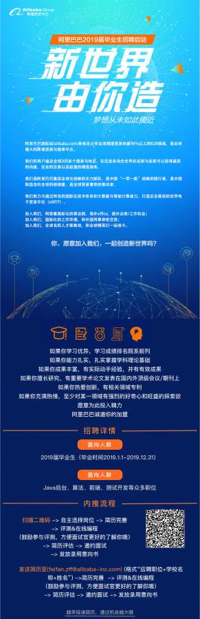 阿里巴巴国际站alibaba.com聚焦在占有全球跨境贸易体量90%以上的B2B领域,是全球最大的跨境贸易与交易平台。 我们的用户遍及全球200多个国家与地区,在这里来自全世界的买家与卖家可以获得高效的沟通,安全的交易以及超值的增值服务。 我们是阿里巴巴集团全球化战略的主力部队,是中国“一带一路”战略的践行者,是中国制造走向全球的助推器,是全球贸易繁荣的助推者。 我们致力与通过特色的国际化技术体系和大数据与智能计算能力,打造安全高效的世界电子商务平台(eWTP)。 加入我们,阿里最国际化的事业部,海外Office,国外出差/工作机会; 加入我们,国际化的工作环境,和国外同事亲密交流; 加入我们,全球名校人才聚集地,和全球精英们一起战斗。 现部门业务扩展,急需大量人才,多岗位,多HC,诚邀请你的加盟!! 通过下列方式获得内推,可免笔试直接面试!! 【招聘岗位】 算法工程师-机器学习、 算法工程师-图像图形、 算法工程师-自然语言处理、 算法工程师-语音对话交互、 算法工程师-运筹优化校招、 算法工程师-其他、 研发工程师JAVA、 研发工程师C/C++、 客户端开发工程师、 前端开发工程师、 测试开发工程师 【内推流程】 以下三种方式均可获得内推资格: 1. 扫描二维码 -> 自主选择岗位 -> 完善简历 -> 测评&在线编程(鼓励参与,方便面试官更好了解你)-> 简历评估 -> 邀约面试 -> 发放录用意向书 2. 点击内推链接-> 自主选择岗位 -> 完善简历 -> 测评&在线编程(鼓励参与,方便面试官更好了解你)-> 简历评估 -> 邀约面试->发放录用意向书 alibaba.tupu360.com/campusActivity/getActivityInfo?spm=a1z43.7404142.0.0.68d96ef5Qda76Z&activityCode=K7ztYXzlouNbPf%2Fx%2FB2Wq1McLwp76uYHvO3tSfhexI8%3D 3. 发送简历至feifan.zff@alibaba-inc.com,格式“应聘职位+学校全称+姓名” -> 完善简历 -> 测评&在线编程(鼓励参与,方便面试官更好了解你)-> 简历评估 -> 邀约面试 -> 发放录用意向书 PS: 通过以上三种方式获得内推资格后,请同学们尽快通过公司的确认邮件完善自身简历,越早完善,通过几率越高。 5733608_1532315935080_ABA3B650AD9AB3EDC25AB221EC17F93B.jpg [ Last edited by feifan_zff on 2018-7-30 at 17:54 ] [ Last edited by feifan_zff on 2018-7-30 at 17:54 ] [ Last edited by feifan_zff on 2018-7-30 at 17:55 ] [ 来自版块群 浙江 ] |