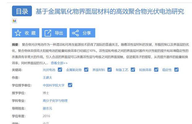 标题:基于金属氧化物界面层材料的高效聚合物光伏电池研究 作者 王建太 中国科学院大学 博士论文 |