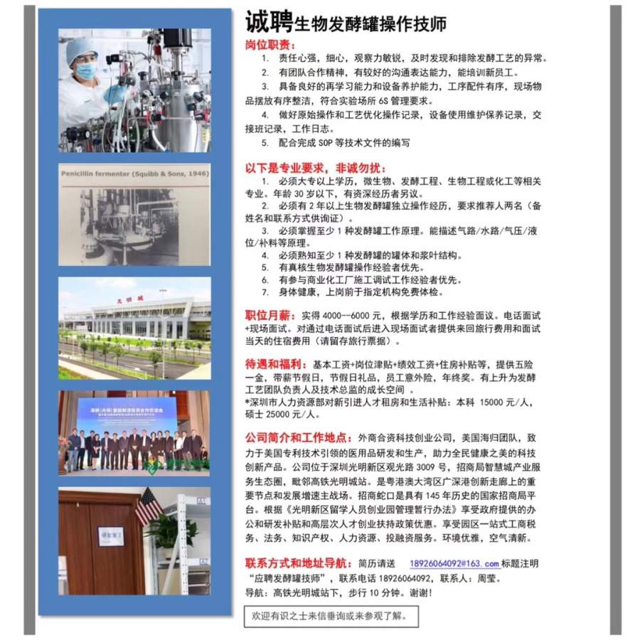 岗位职责: 1. 责任心强,细心,观察力敏锐,及时发现和排除发酵工艺的异常。 2. 有团队合作精神,有较好的沟通表达能力,能培训新员工。 3. 具备良好的再学习能力和设备养护能力,工序配件有序,现场物品摆放有序整洁,符合实验场所6S管理要求。 4. 做好原始操作和工艺优化操作记录,设备使用维护保养记录,交接班记录,工作日志。 5. 配合完成SOP等技术文件的编写 以下是专业要求,非诚勿扰: 1. 必须大专以上学历,微生物、发酵工程、生物工程或化工等相关专业。年龄30岁以下,有资深经历者另议。 2. 必须有2年以上生物发酵罐独立操作经历,要求推荐人两名(备姓名和联系方式供询证)。 3. 必须掌握至少1种发酵罐工作原理。能描述气路/水路/气压/液位/补料等原理。 4. 必须熟知至少1种发酵罐的罐体和浆叶结构。 5. 有真核生物发酵罐操作经验者优先。 6. 有参与商业化工厂施工调试工作经验者优先。 7. 身体健康,上岗前于指定机构免费体检 608330941364802281.jpg [ 来自版块群 广东 ] |