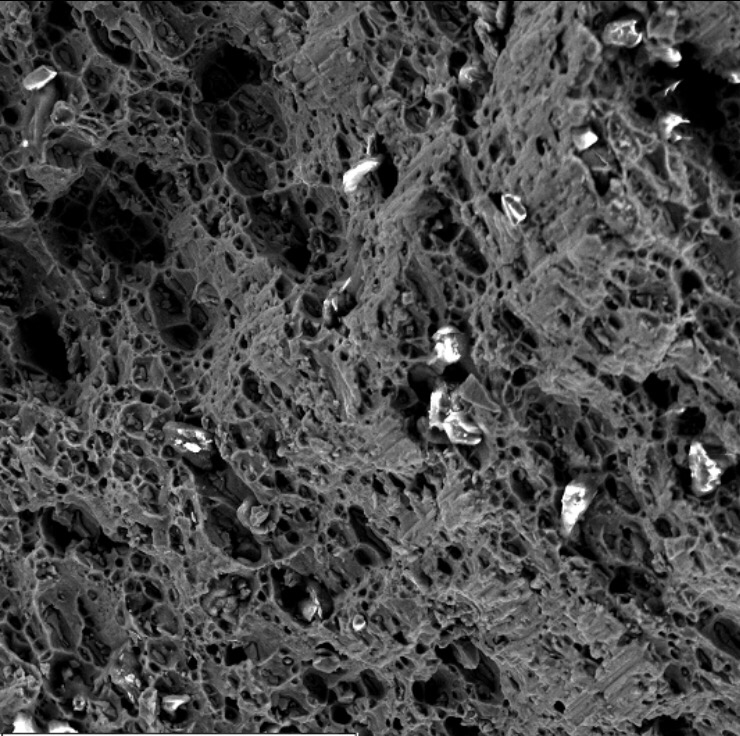 韧性断裂为主,可以看出有大小不一韧窝,同时伴随有河流状的脆性断裂,还有少量的颗粒断裂留下的凹坑