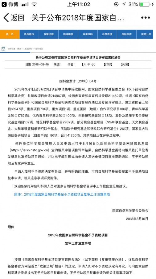 国家自然科学基金申请项目评审结果的通告 已有1人参与
