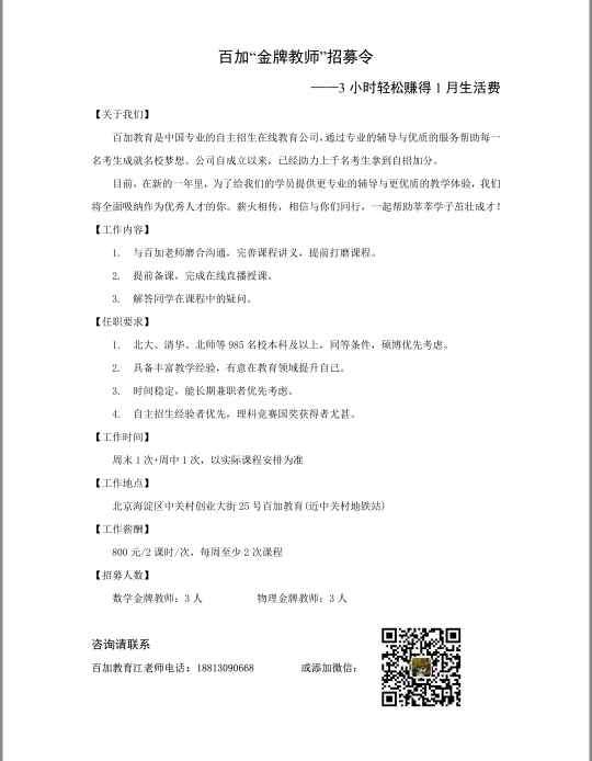 1.北大、清华、北师大等985名校本科及以上,同等条件硕博优先考虑 2.具有丰富教学经验,有意在教育领域提升自己 3.时间稳定,能长期工作者优先考虑 4.自主招生经验者优先,理科竞赛国奖者优先 发自小木虫Android客户端 |