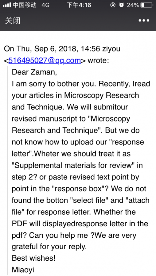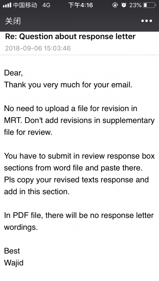 昨天修回了一篇稿子,是wily旗下的Microscopy Research and Technique 期刊,scholarone投稿系统,但我在上传response letter是发现这个没有那种上传按钮,值给了一个框框,所以我把之前准备好的respoonse letter的word内容占进去了,但是在生成pdf食物,并没有显示出response letterl的内容只有我的修改稿。是不是我操作错了,请各位大神帮帮忙。复审标记的回信里的话: When submitting your revised manuscript, please upload a point by point response to the reviewers which you must upload in the "response to decision letter" box. Please also mark your manuscript with red text where you made any changes. IMPORTANT: We have your original files. When submitting (uploading) your revised manuscript, please delete the file(s) that you wish to replace and then upload the revised file(s). |