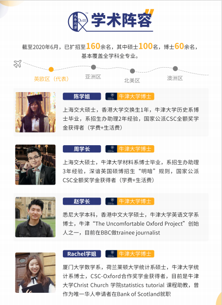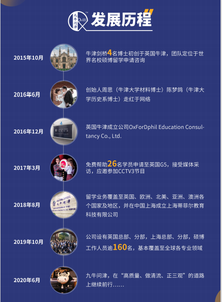 一、团队简介 九牛问津,由4位牛津剑桥大学博士组建,公司成员覆盖至全世界范围知名高校硕博士团体。我们以“高质量、正三观、做清流”为核心理念,致力于教育、留学、科技研发领域,包括:名校硕博留学申请、在线1对1课程、人工智能研发、人工皮肤研发等,旨在净化留学环境、革新教育产业、助力科研发展。2020年,我们将继续砥砺前行,不忘初心。详情请见: founded by four ph.d students from the university of oxford and the university of cambridge, oxfordphil is an education consultancy and technology company which constantly contributes to the advancement of education and technology, especially to oversea studies, online courses, research of artificial intelligence and prosthetic skin. composed of ph.d students from the top universities all over the world, we strive for innovations, reforms and improvements in both education and technology. in 2020, we will keep our original aspirations and purpose while taking up the challenge and forging ahead by persistently exceling in quality, practicing righteousness and bringing a breath of fresh air into the industries. 二、发展历程 三、历年战绩 四、实力保障 五、学术阵容(代表成员) 六、留学服务(为防止机构/个人套取信息,具体辅导方式等请私信咨询) 七、留学干货 九牛问津团队留学纯干货将陆续在公派出国和留学diy等版块无广发布,欢迎关注作者帖子。为符合小木虫相应版规,除该版以外帖子,将不进行任何推广服务。同时,郑重申明,本团队所创作干货皆为原创,首发于知乎号【九牛问津留学】及公众号【九牛问津】,音频可见喜马拉雅账号【牛津学长说留学】。我已加入“维权骑士”的版权保护计划。未经允许,严禁任何形式转载或者盗用,违者必究。 八、联系我们 1、小木虫商家信息:九牛问津团队 2、九牛问津前端咨询微信:dy_941105 3、淘宝店铺:九牛问津专属店(点击进入) [ Last edited by freedomzzr on 2021-3-12 at 11:14 ] |