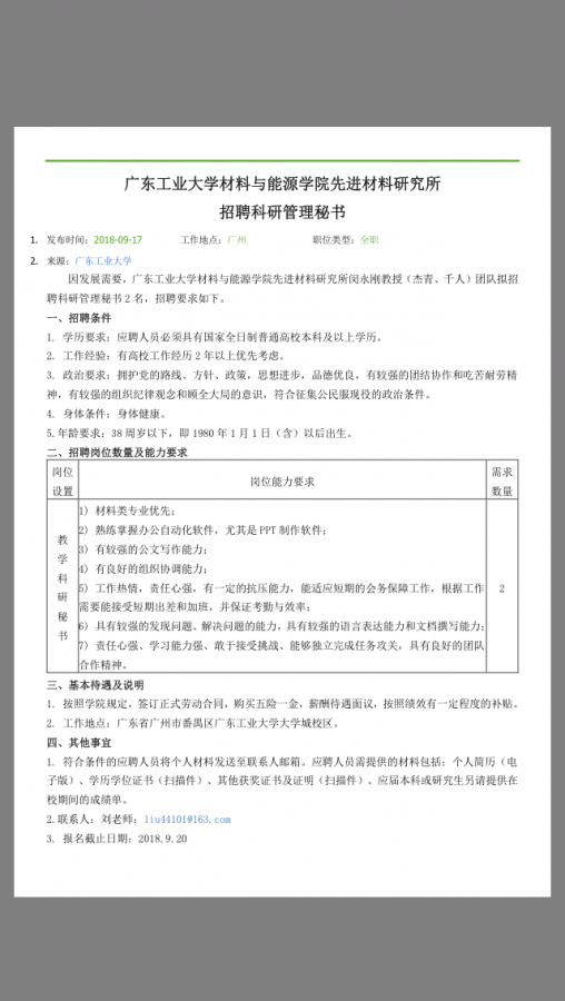 广东工业大学材料与能源学院先进材料研究所科研秘书招聘