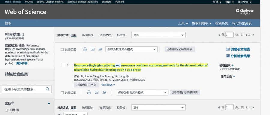 Li, J., Yang, X., Yang, J., & Lai, L. (2016). Resonance Rayleigh scattering and resonance nonlinear scattering methods for the determination of nicardipine hydrochloride using eosin Y as a probe. RSC Advances, 6(31), 25887-25893. 求该文献在web of science上的被引用次数报告页面。导出或截图均可。多谢 |