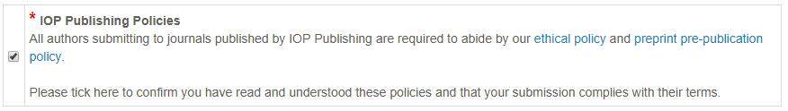 有朋友投稿过Methods and Applications in Fluorescence吗?我在投稿的第六步中总是遇到“IOP Publishing Policies is a required field”的提示,但是我已经在相应的选项打了√了,不知道有没有人遇到过相似的情况呢?求助求助! QQ截图20180924100121.jpg QQ截图20180924100228.jpg |