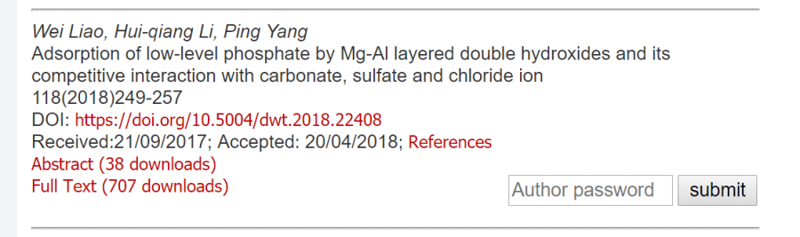 在desalination and water treatment上投了 看状态应该是见刊了 请问怎么下载全文呢 author password 是什么密码呀 和登陆密码不一样吗 QQ图片20180928095210.png |