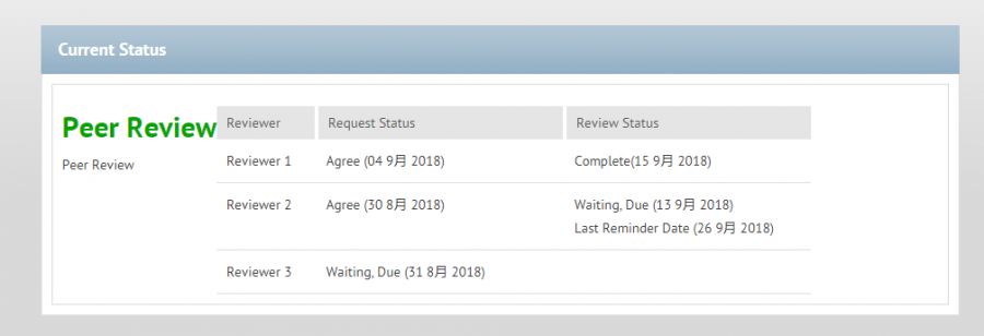 如图,一共有两个reviewer,一个已经审完了,另一个都提醒了三次了还是没有任何消息。如果一直没有消息的话,编辑要等多久啊?我看到有的人的稿子等了两个多月,被提醒了十几次审稿人都不回复感觉很慌啊 要不要给编辑发邮件问问?QQ截图20180928100924.png |