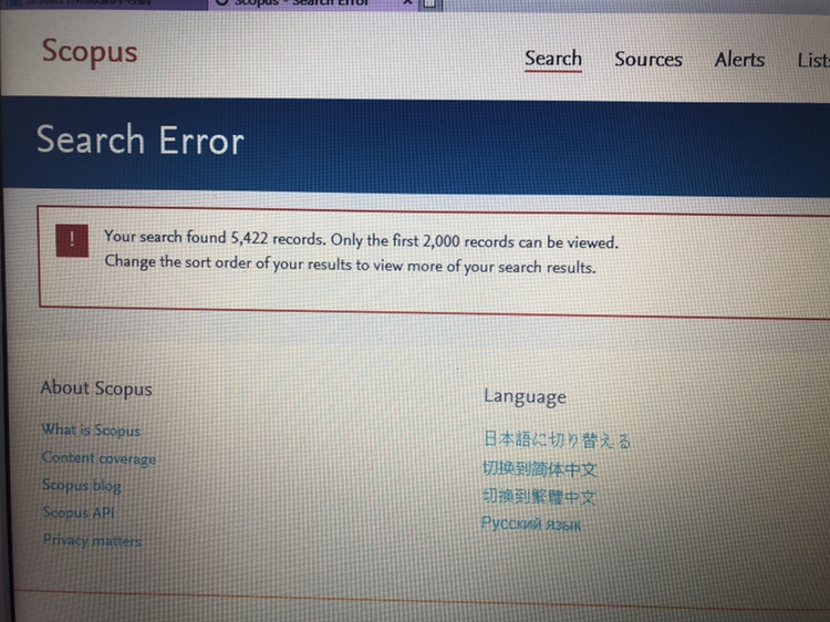 本人刚在Scopus输入关键词搜索文献 结果显示有5422篇 但是看完前2000篇后 系统提示无法继续浏览 还请大神帮忙想办法解决下 万分感谢
